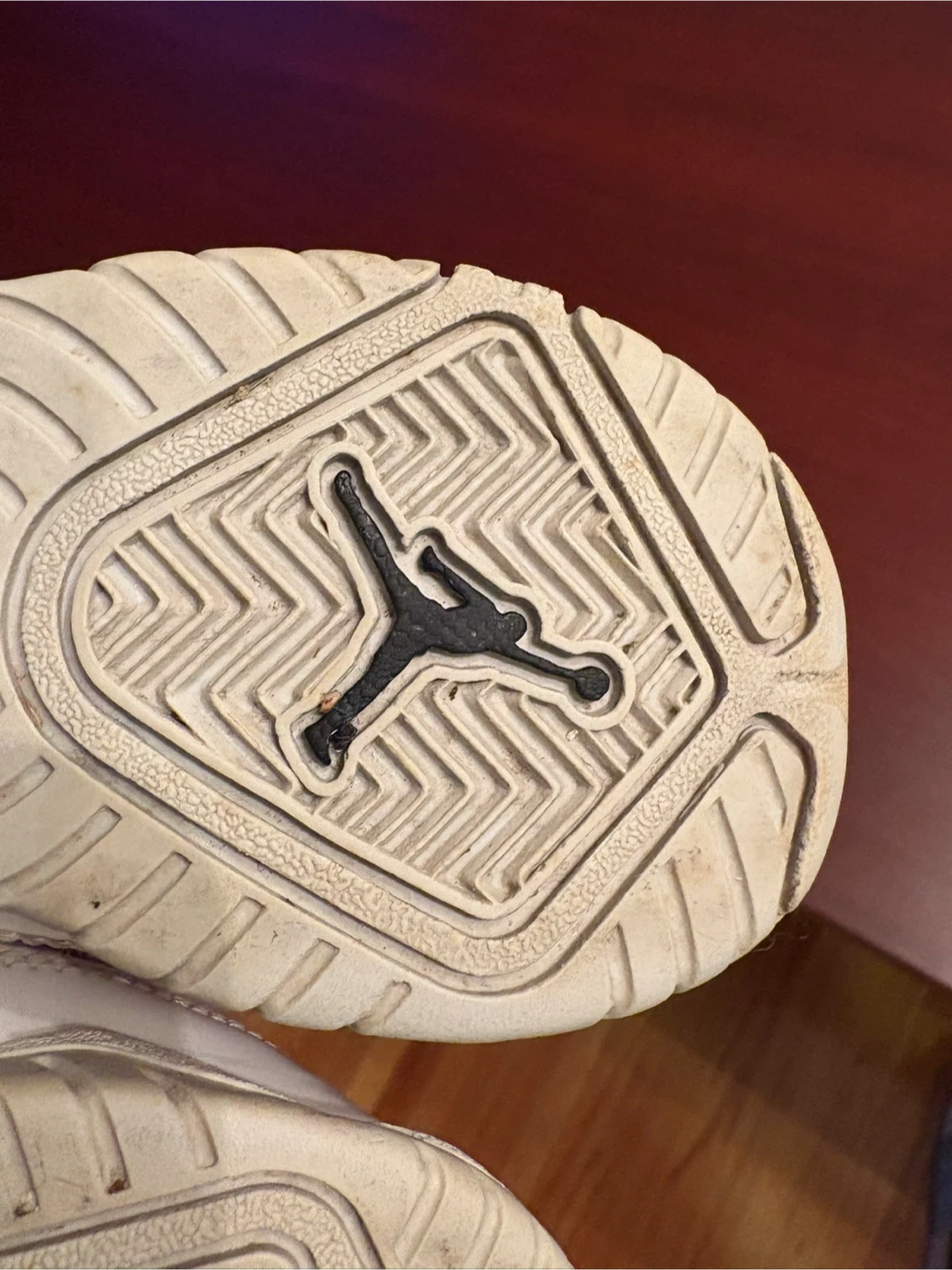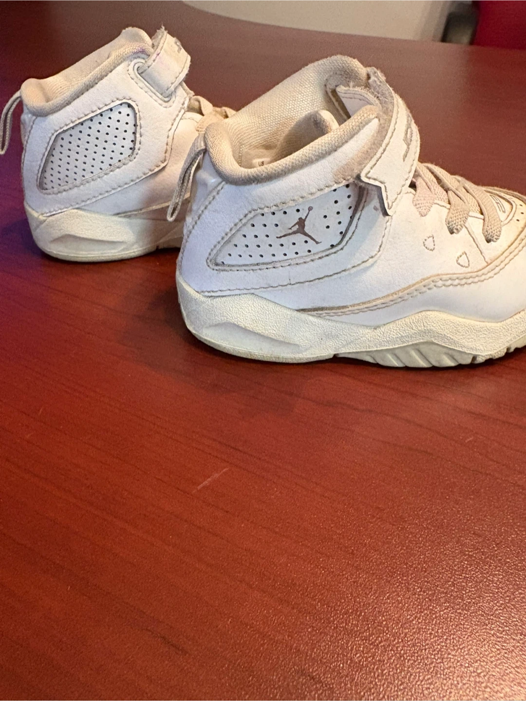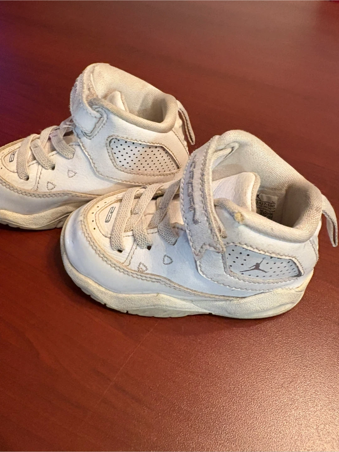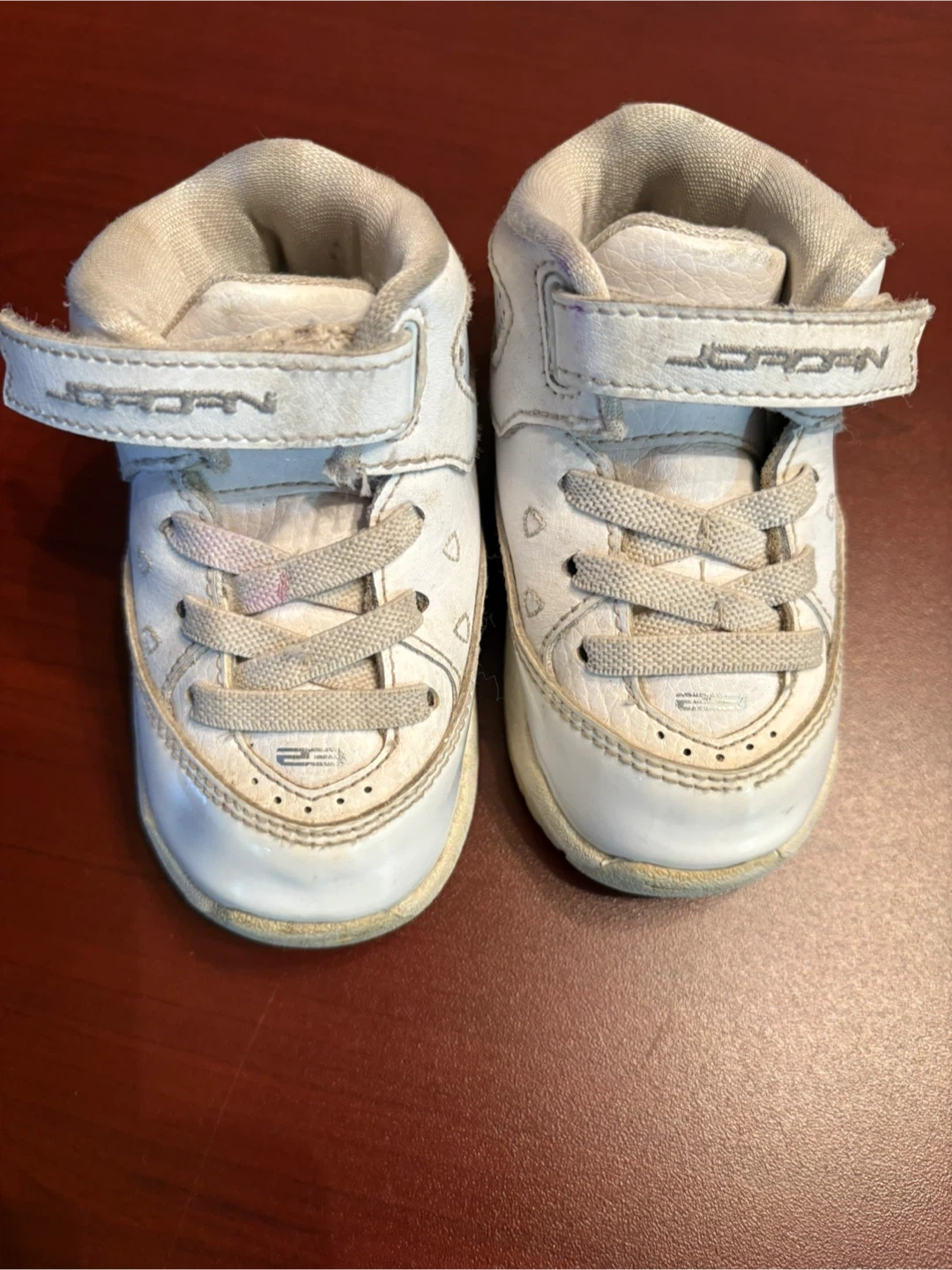 White Jordan crib shoes with velcro strap. Size 5C Classic Jordan logo on the sole. Perfect for little ones learning to walk! Approximate Foot Length: 4.9–5 inches or ~12.6–13 cm. Age beginning around 9+ months and up.