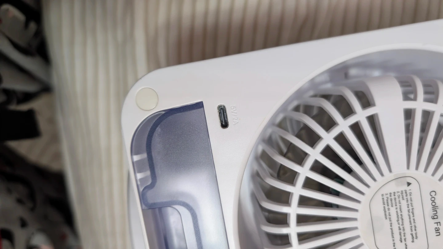 This is a portable oscillating air cooler fan. It features a 600ML water tank capacity and multiple speed settings. The fan includes a timer function and colourful lights. It charges via Type-C. Power is 10W. No cord.