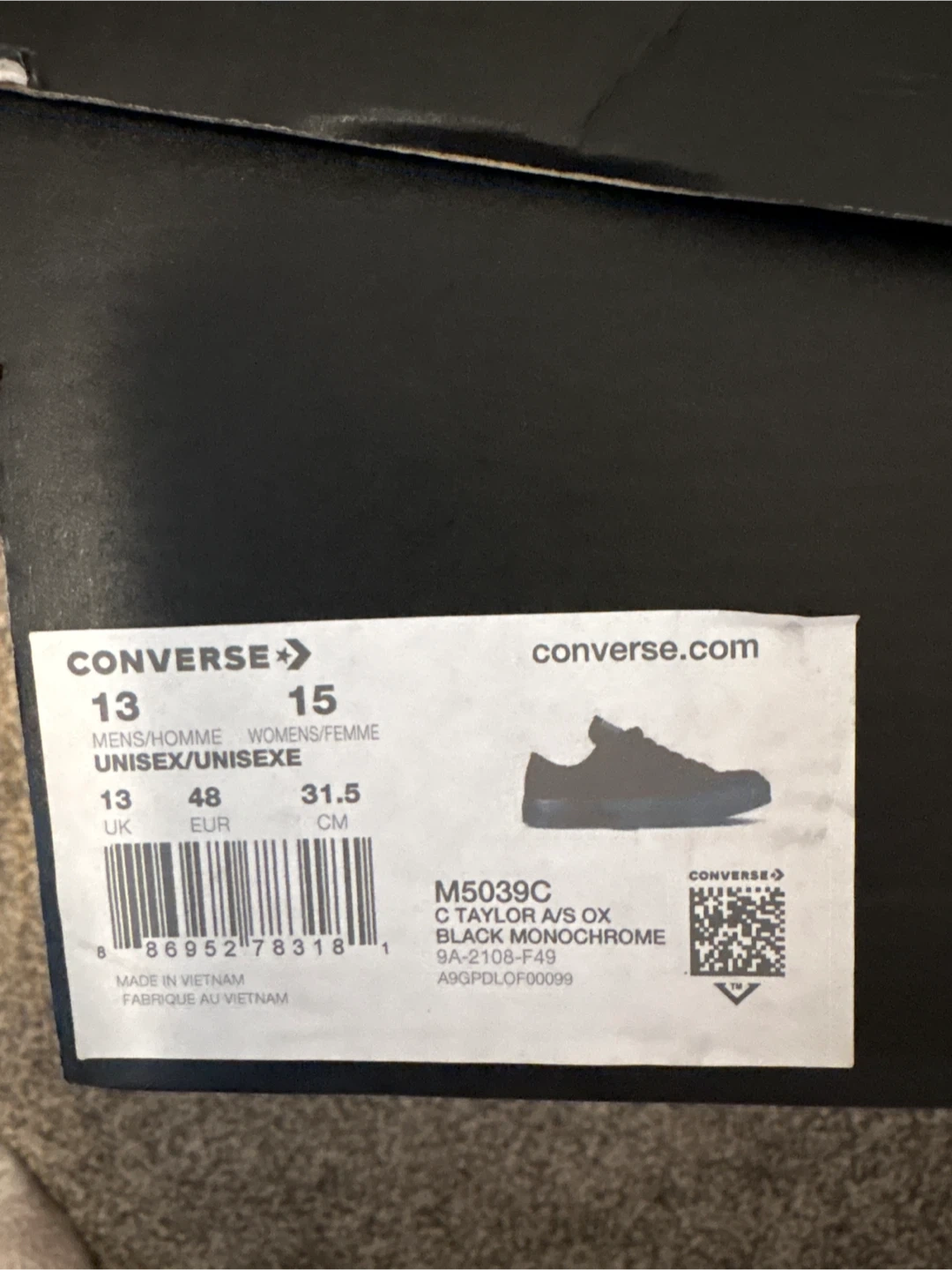 Classic Converse Chuck Taylor All Star Ox sneakers in black monochrome. These unisex shoes are size 13 (US Men's) / 15 (US Women's), which is equivalent to 31.5 CM or 13 UK / 48 EUR. They're made with a canvas upper and rubber sole. Great for everyday wear! New in box!