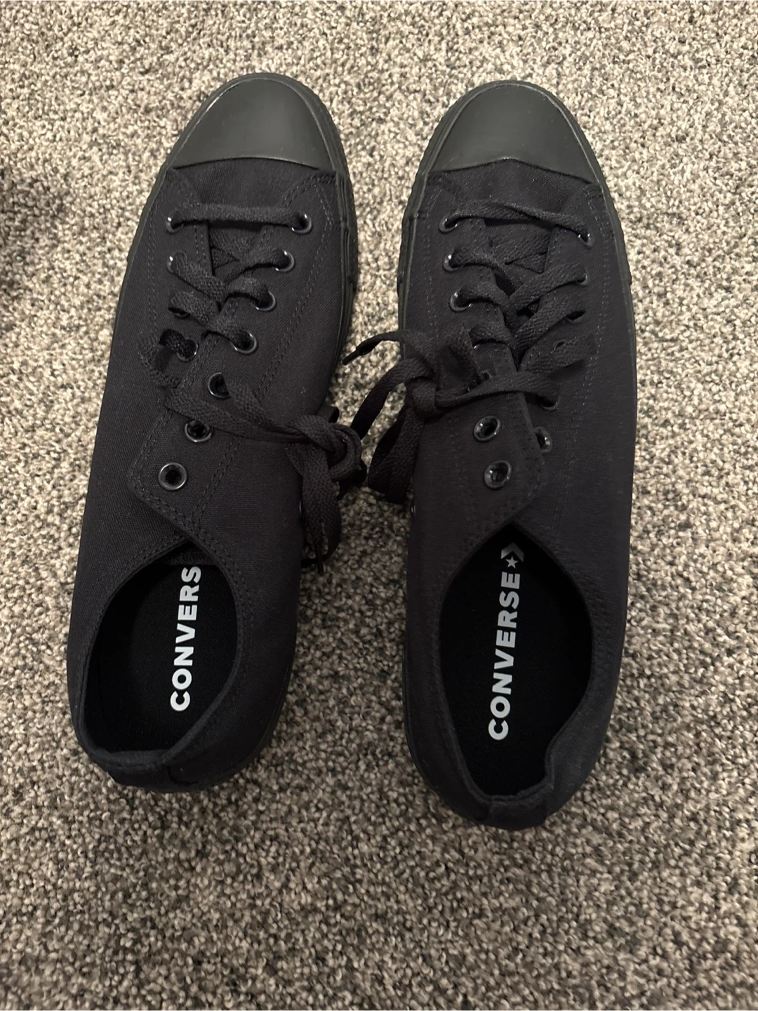 Classic Converse Chuck Taylor All Star Ox sneakers in black monochrome. These unisex shoes are size 13 (US Men's) / 15 (US Women's), which is equivalent to 31.5 CM or 13 UK / 48 EUR. They're made with a canvas upper and rubber sole. Great for everyday wear! New in box!