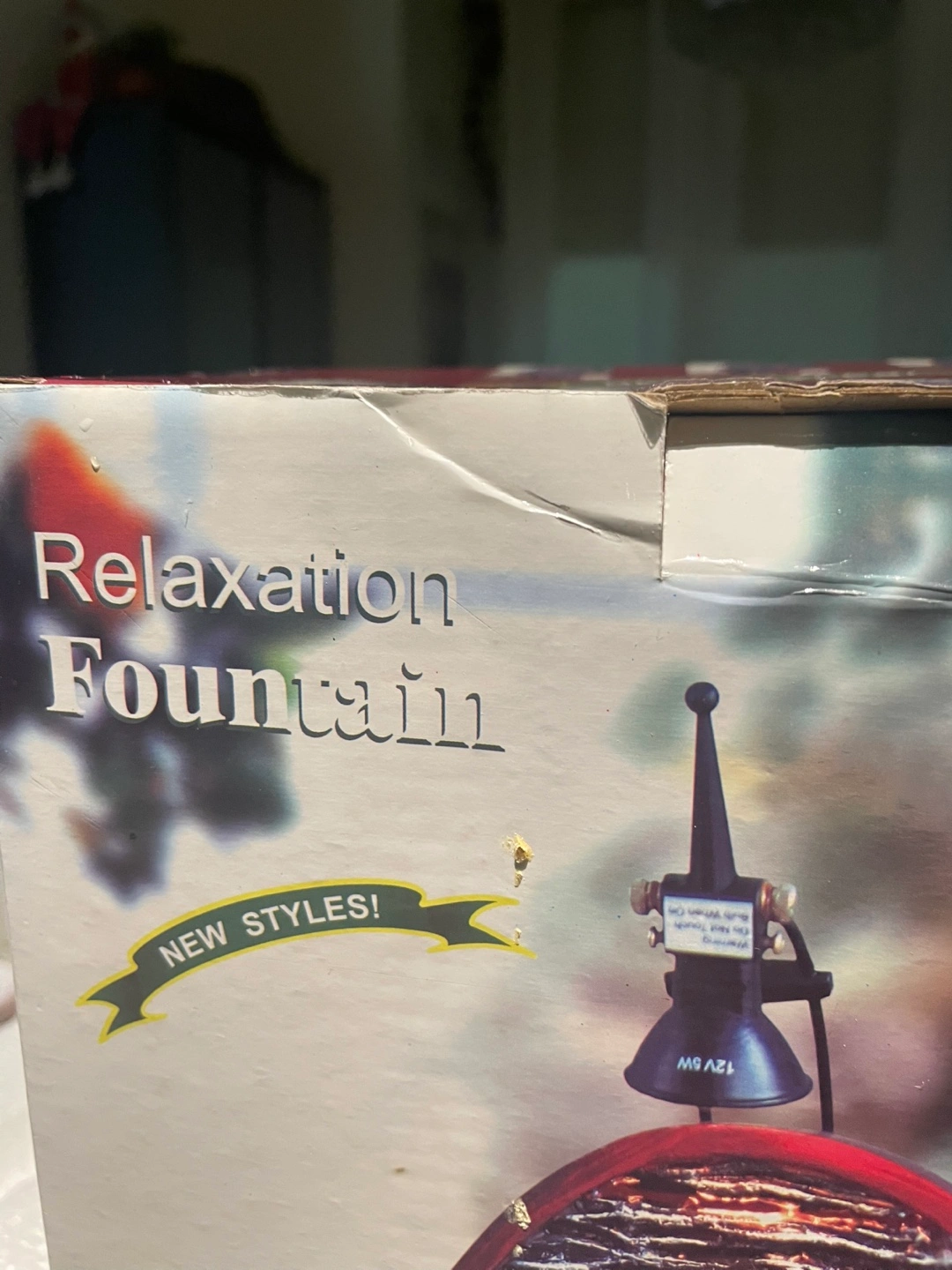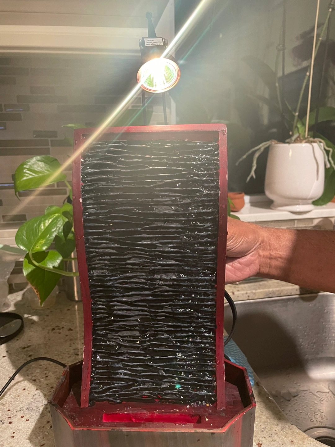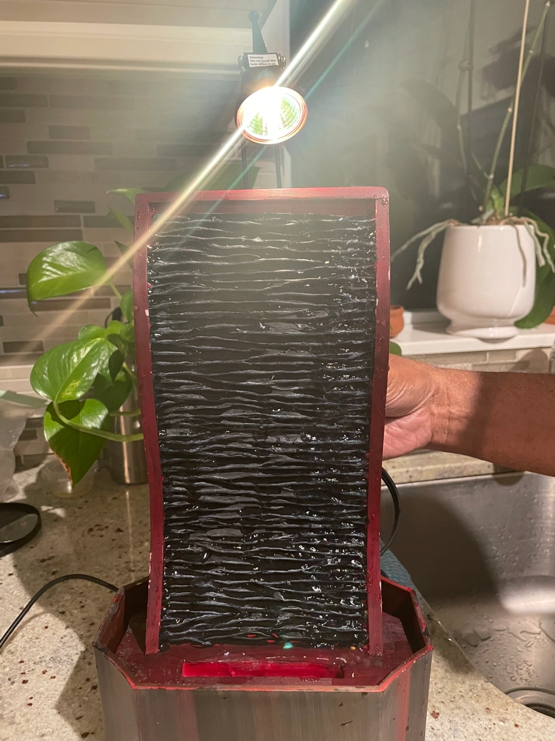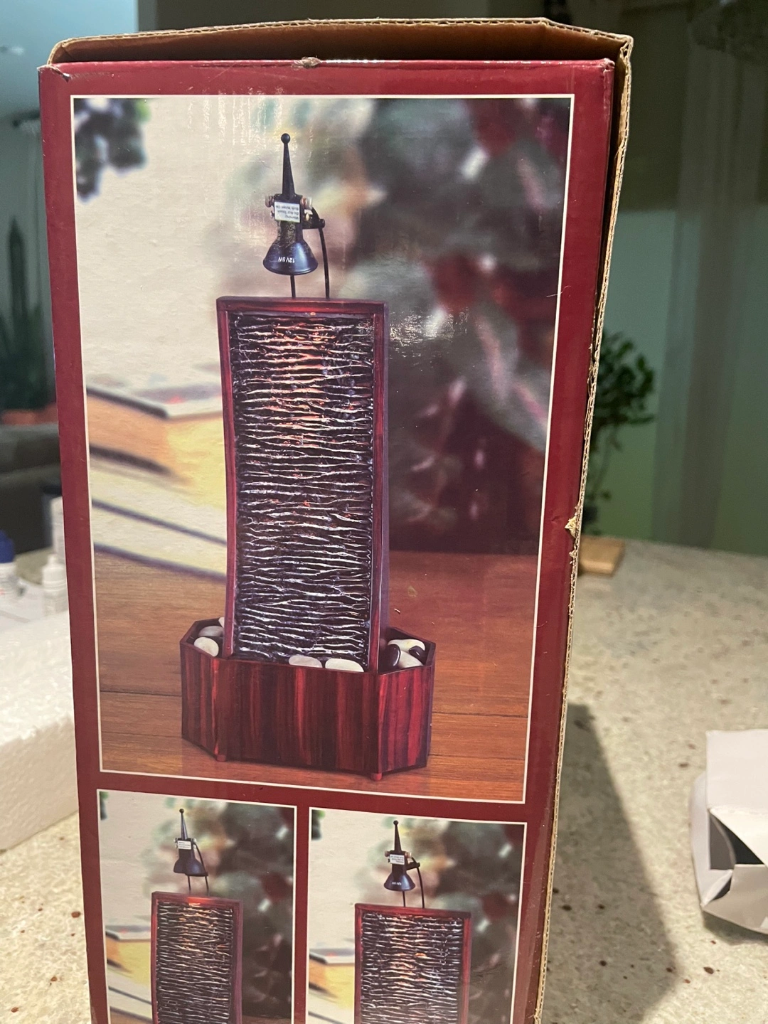 Brand new tabletop relaxing water fountain. Features a dark-coloured water panel, a small light, and a dark reddish-brown base.