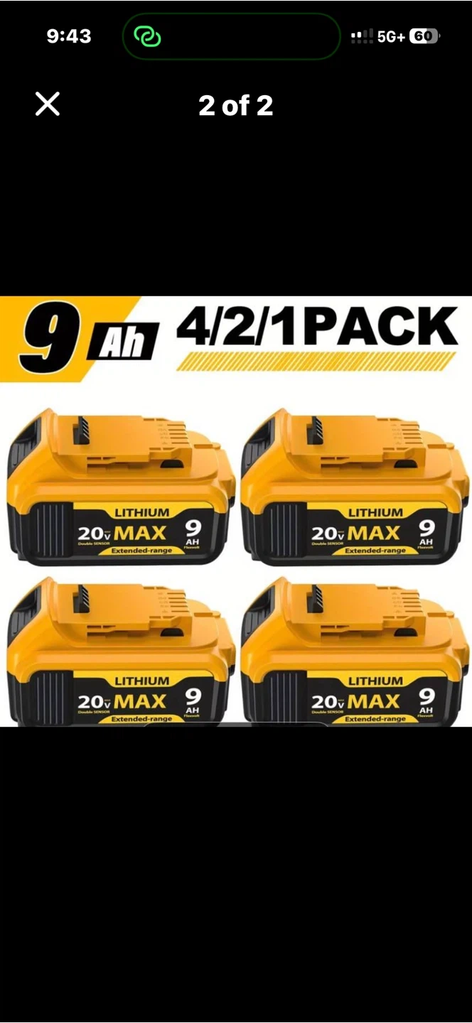 Buy & Sell4-Pack 20V MAX 9Ah Lithium Extended Range Batteries4-Pack 20V MAX 9Ah Lithium Extended Range Batteries$35Four 20-volt MAX 9Ah lithium batteries are included. These are extended-range batteries.BrandDEWALTWHERE TO MEETCheck LocationView MapSELLERRana MasoodFlemingdon Park211 review0 chats·0 favorites·2 viewsSEND CHAT TO SELLERHi Rana Masood! I’m interested in your listing.Hi Rana Masood! I’m interested in your listing.Get the Karrot app to chatSign In to chat