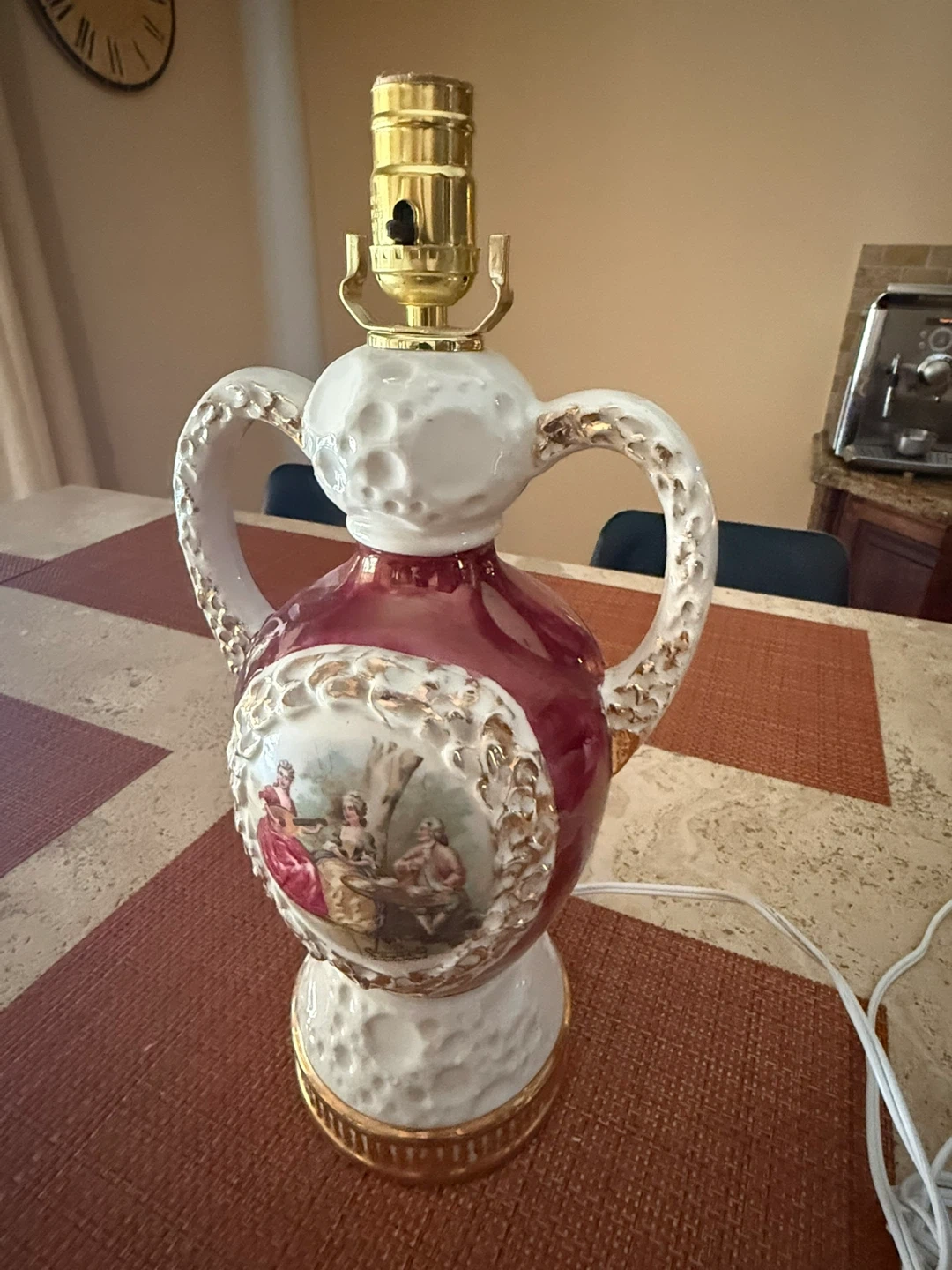 This decorative table lamp features a deep red body with white, textured accents and gold trim. A scenic medallion adorns the front, depicting figures in a garden setting. It's a beautiful piece for any room! Sale as is