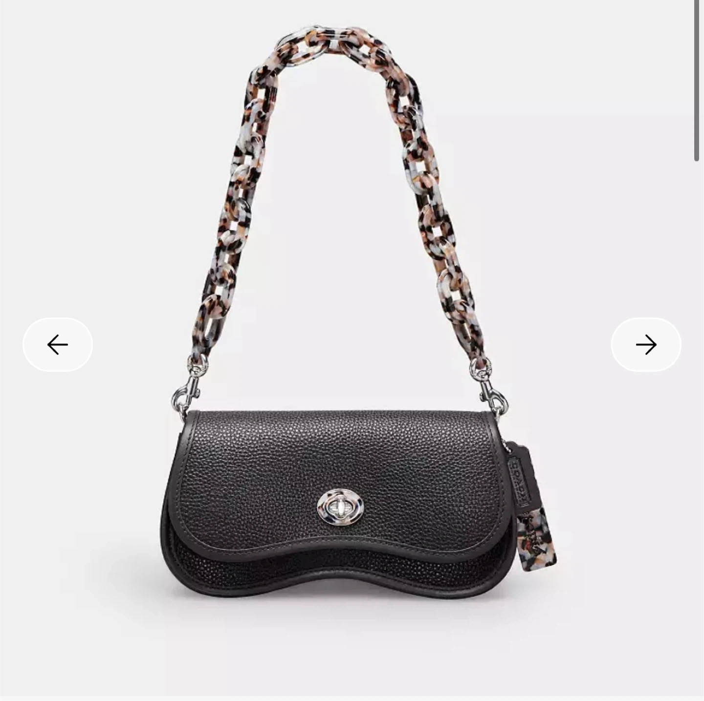 This is a black Coach Wavy Dinky Bag made from Coachtopia Leather. It features a unique wavy silhouette and comes with a distinctive multi-coloured chain strap and matching tag.