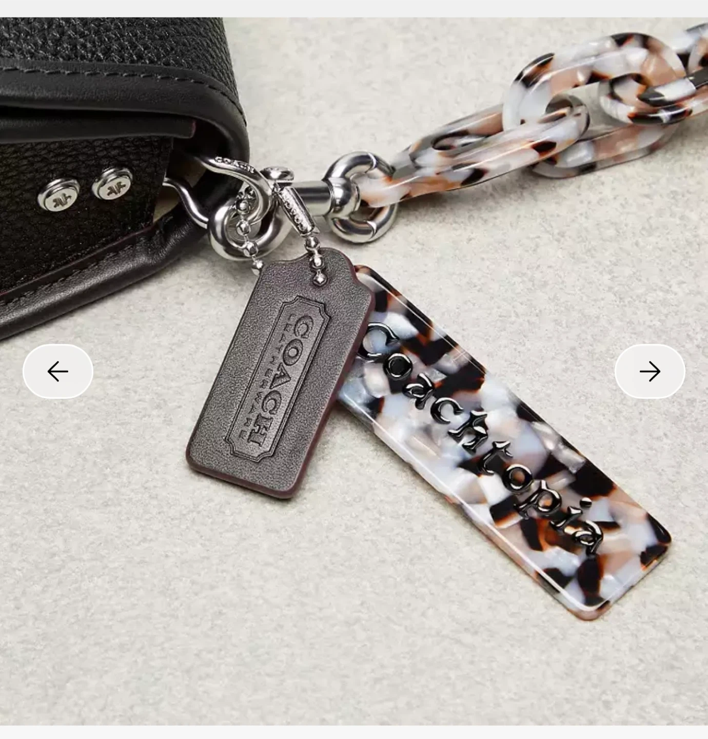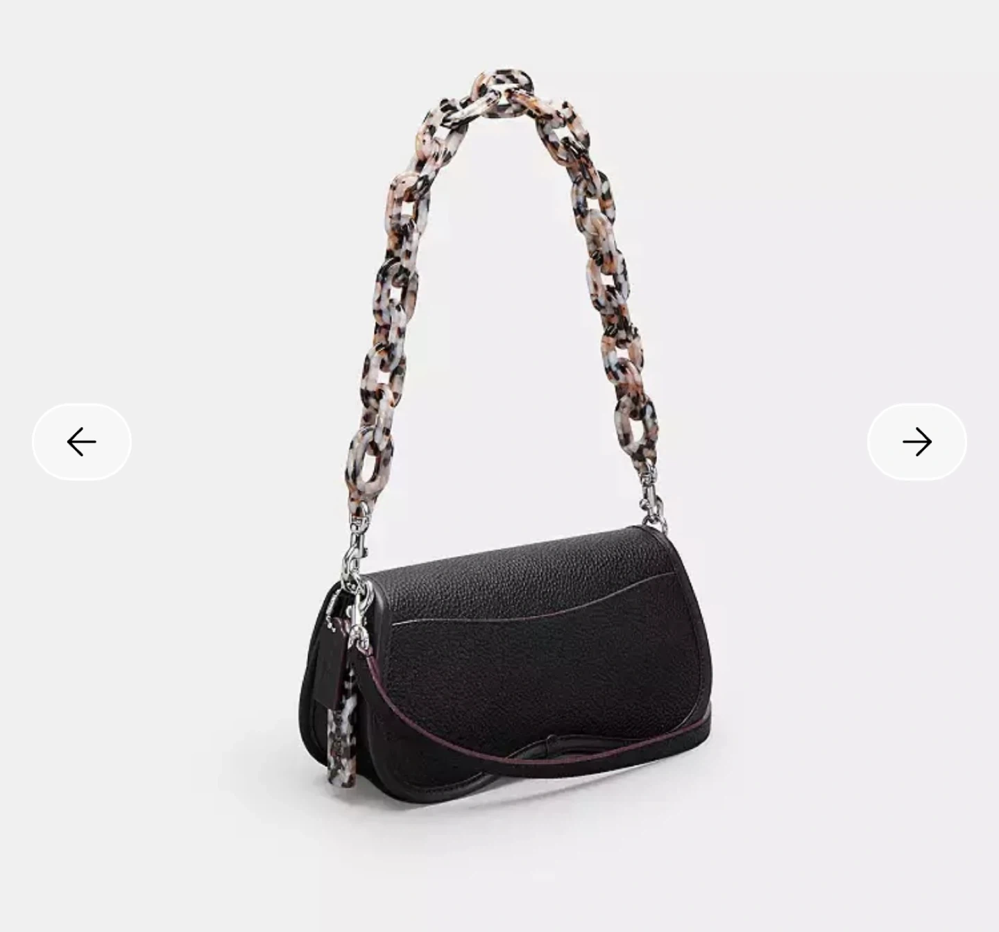This is a black Coach Wavy Dinky Bag made from Coachtopia Leather. It features a unique wavy silhouette and comes with a distinctive multi-coloured chain strap and matching tag.