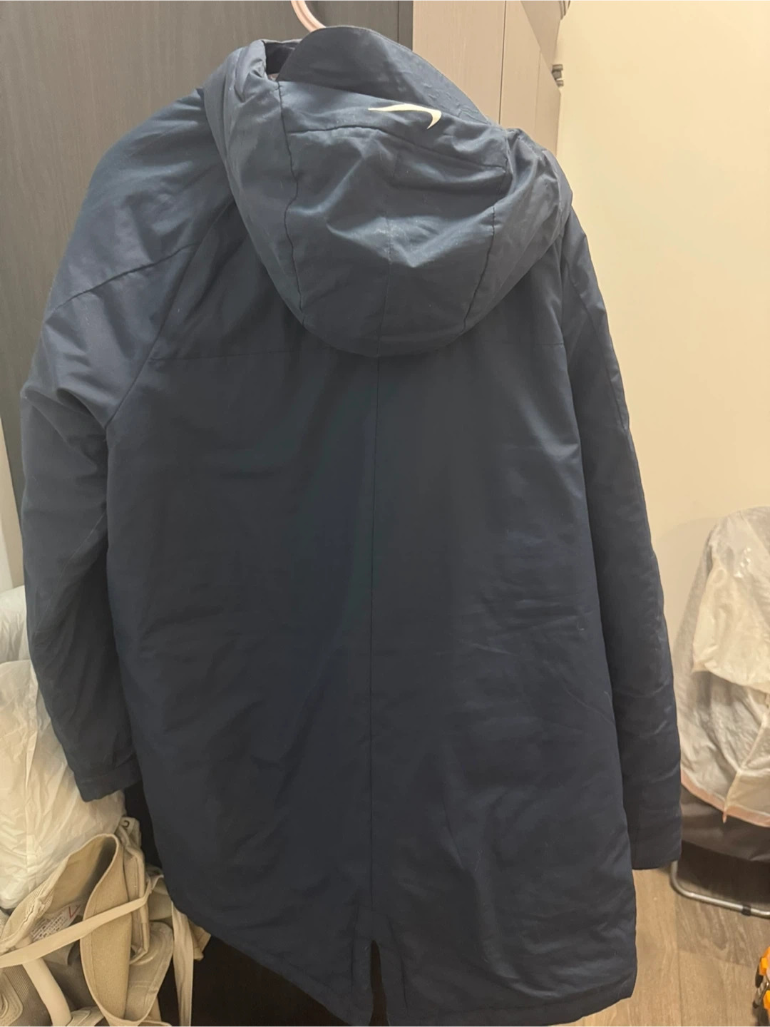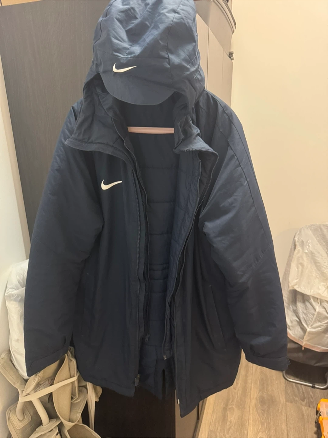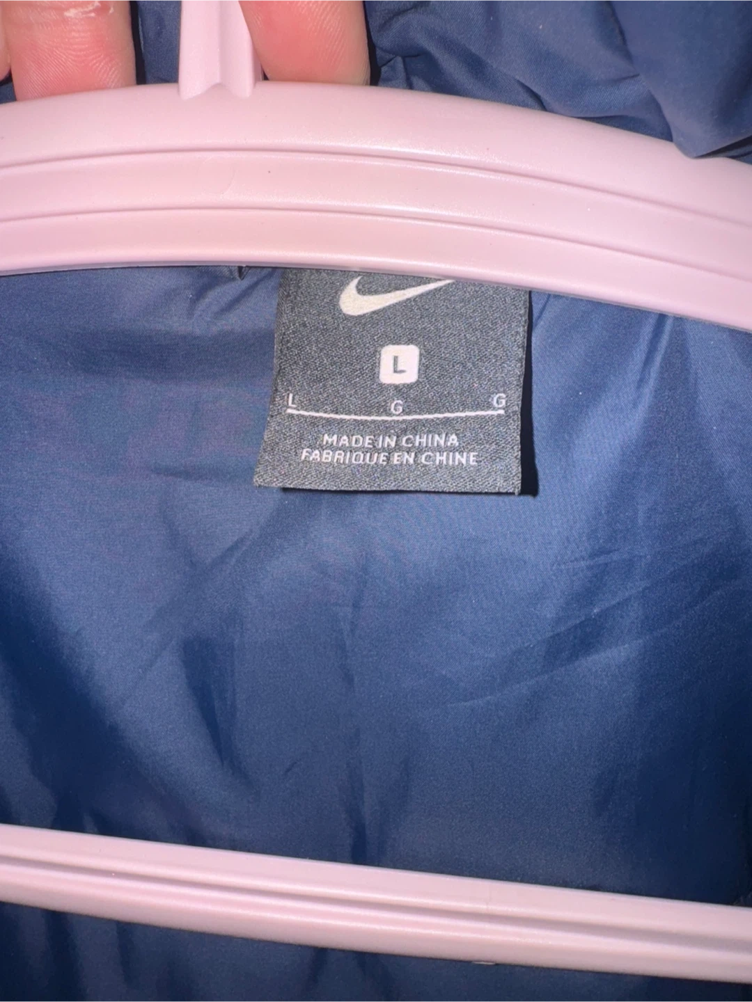 Selling a Nike winter jacket in navy blue, size large. It's in great condition and ready to keep you warm this winter! The jacket is made of 100% polyester.