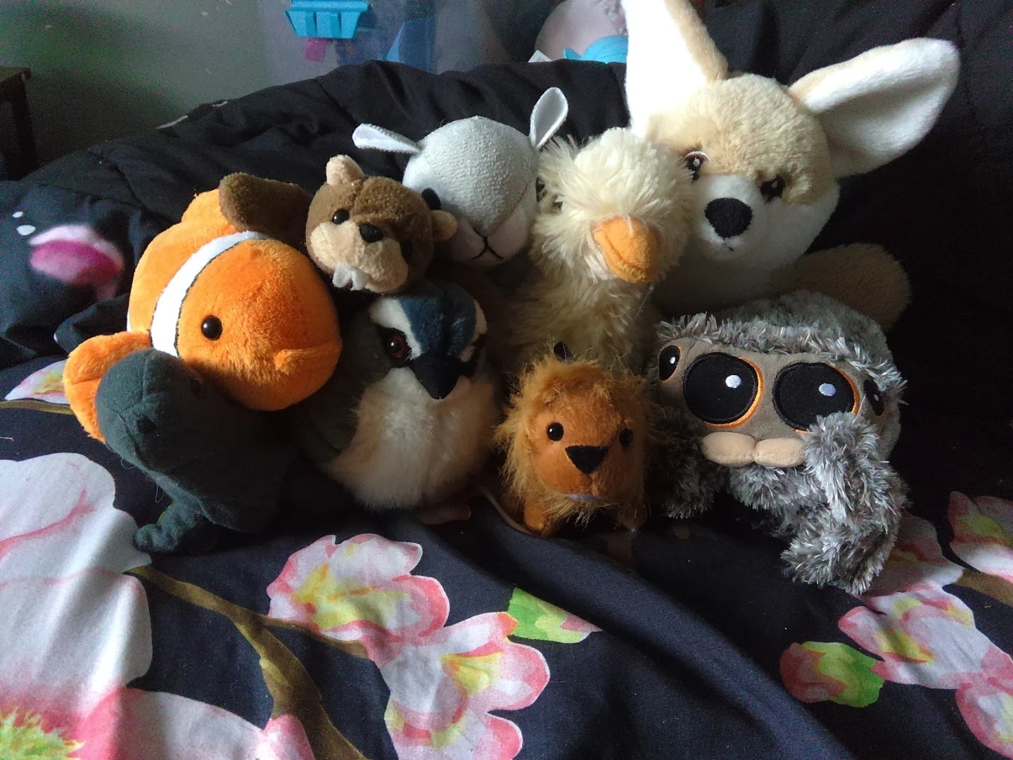 This collection includes several soft plush toys, featuring a clownfish, a fennec fox, a spider, a bird, a squirrel, a lion cub, and a beaver. They're all made of fuzzy material perfect for cuddling. These would be a fun addition to any child's toy collection!