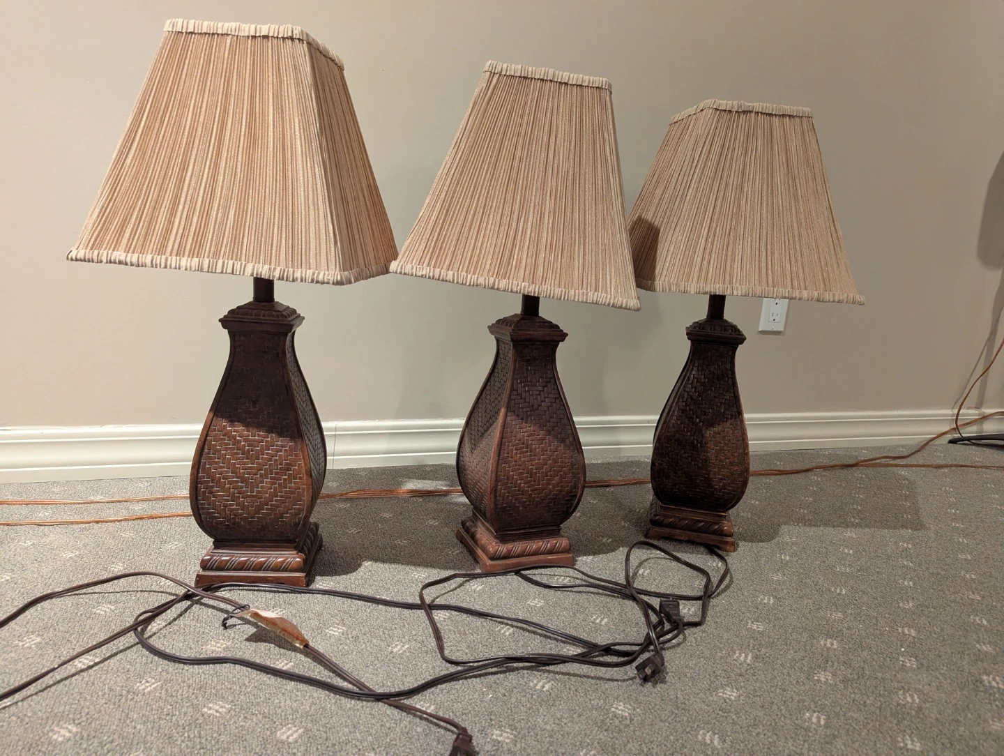 Selling a set of three matching table lamps! They feature a brown wicker base and a beige pleated shade. Perfect for adding a warm, cozy glow to any room in your home