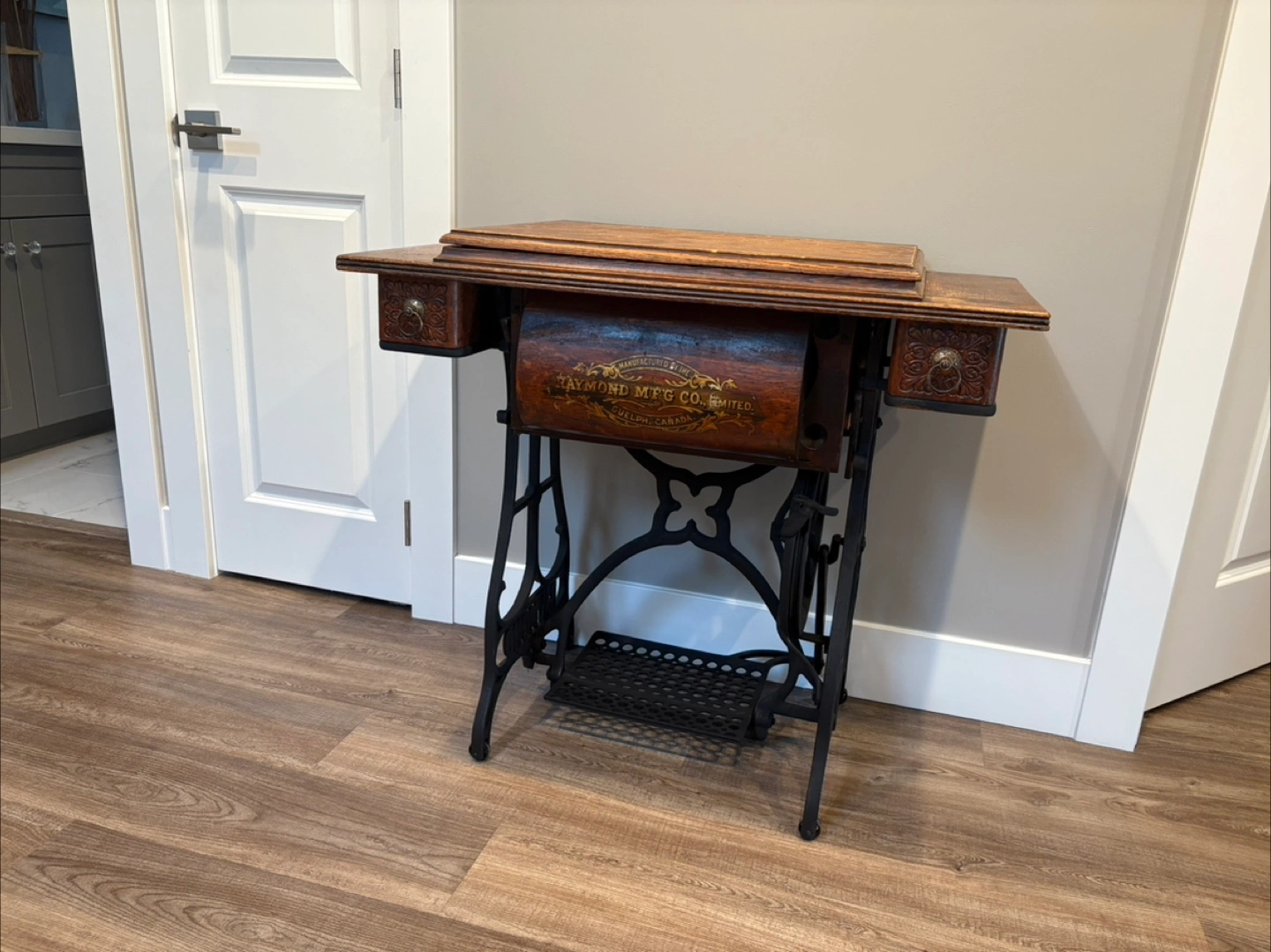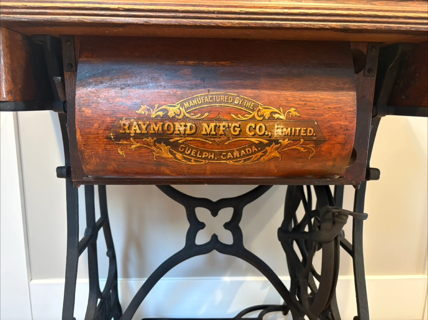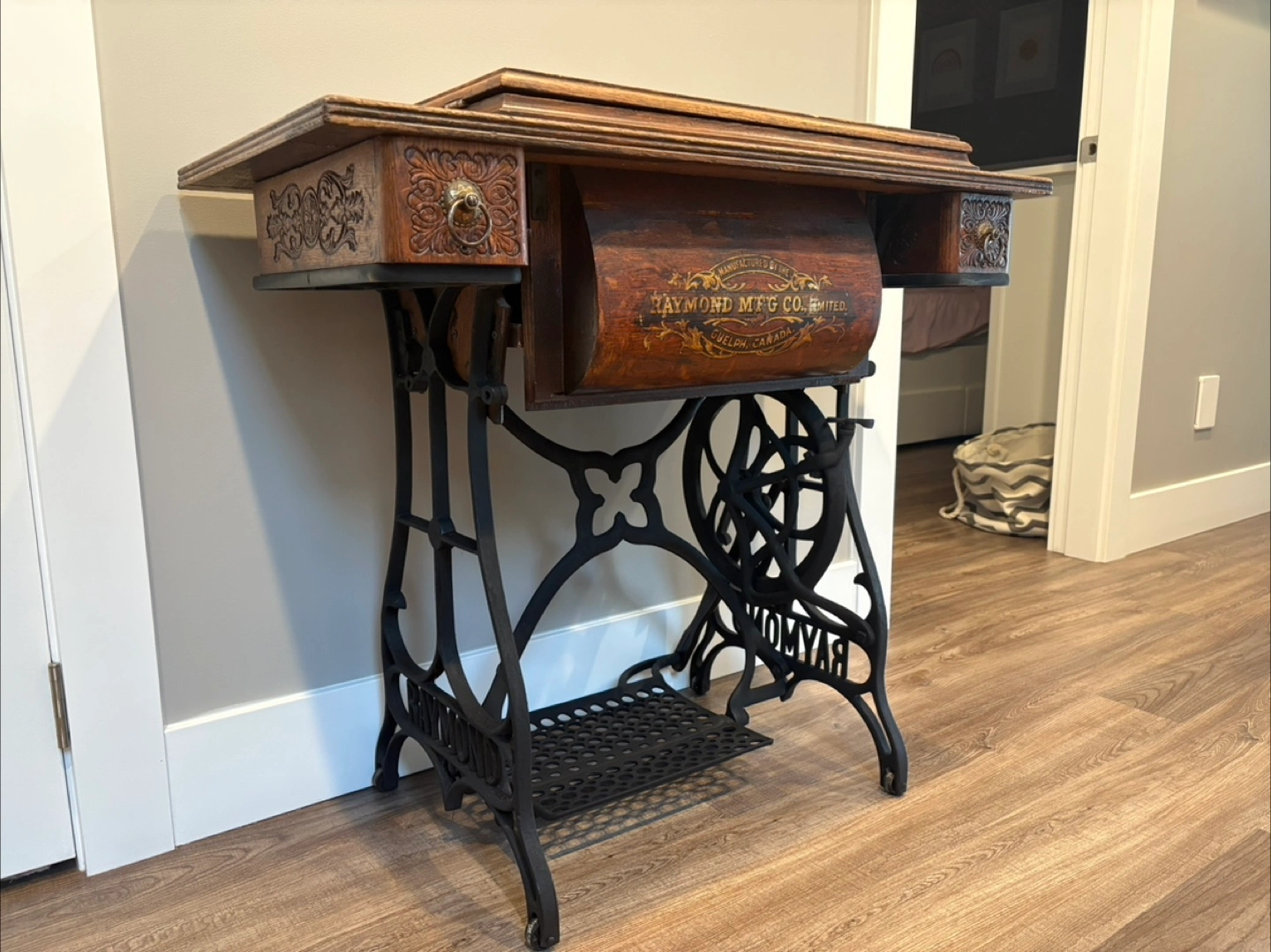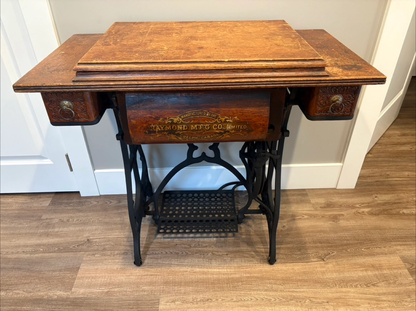 Selling an antique sewing machine table manufactured by the Raymond MFG Co. Limited in Guelph, Canada. It's a beautiful piece with ornate detailing on the drawers and a unique iron base. Perfect for adding a touch of vintage charm to your home!