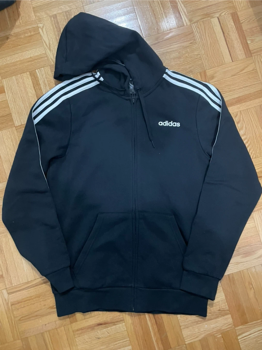 Adidas black full zip hoodie with the classic three stripes on the sleeves!