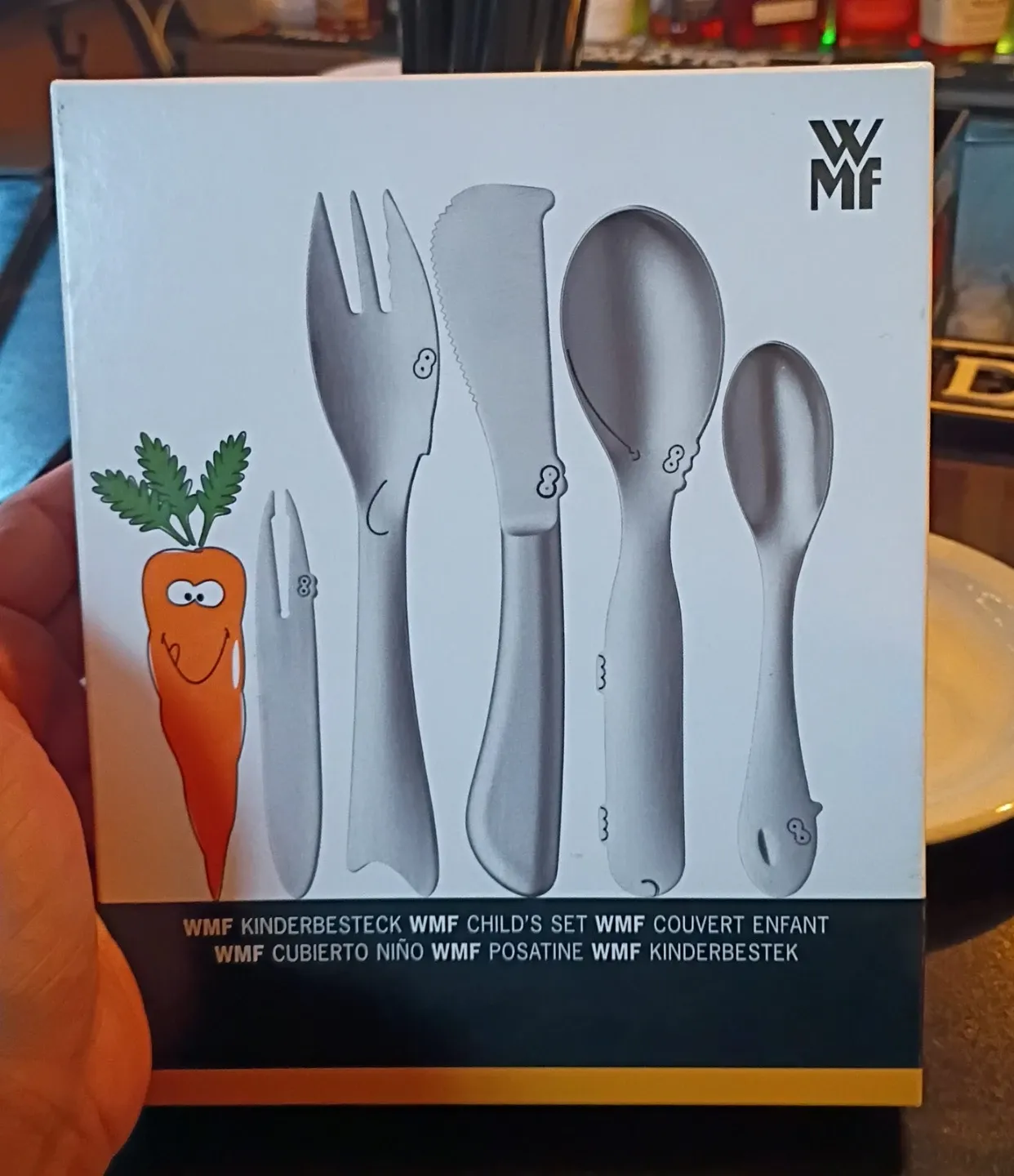 This is a WMF child's cutlery set. It includes a fork, knife, and spoons. The set is made of stainless steel.