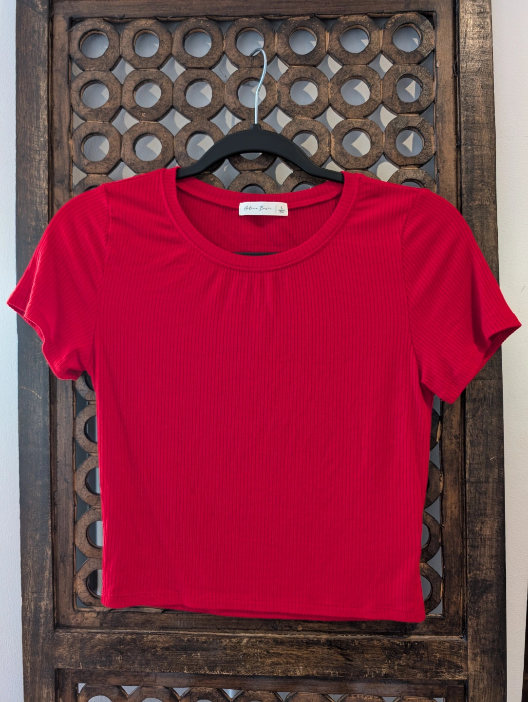 Women's red crop top. Short sleeves. Ribbed material. Round neck. Runs small for a size large.