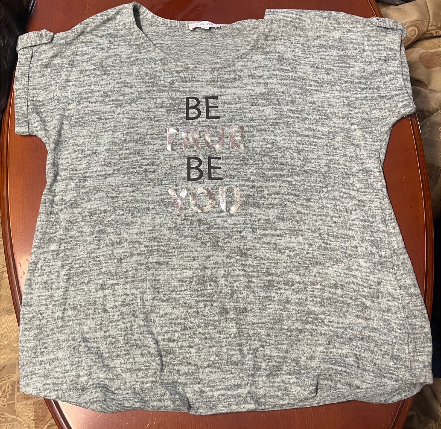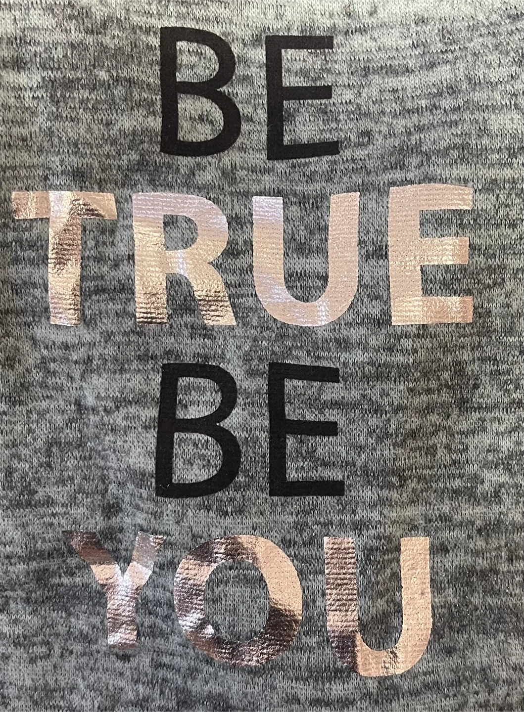 This women’s T-shirt features a metallic "Be True Be You" graphic across the chest. It's made from a soft, comfortable fabric blend. Casual and inspiring, it's a great addition to any everyday wardrobe!