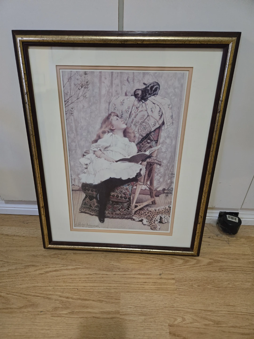 Framed print featuring a young girl engrossed in a book, with a cat perched above her. The artwork is housed in a decorative wooden frame with gold accents. It's a charming piece for any room!