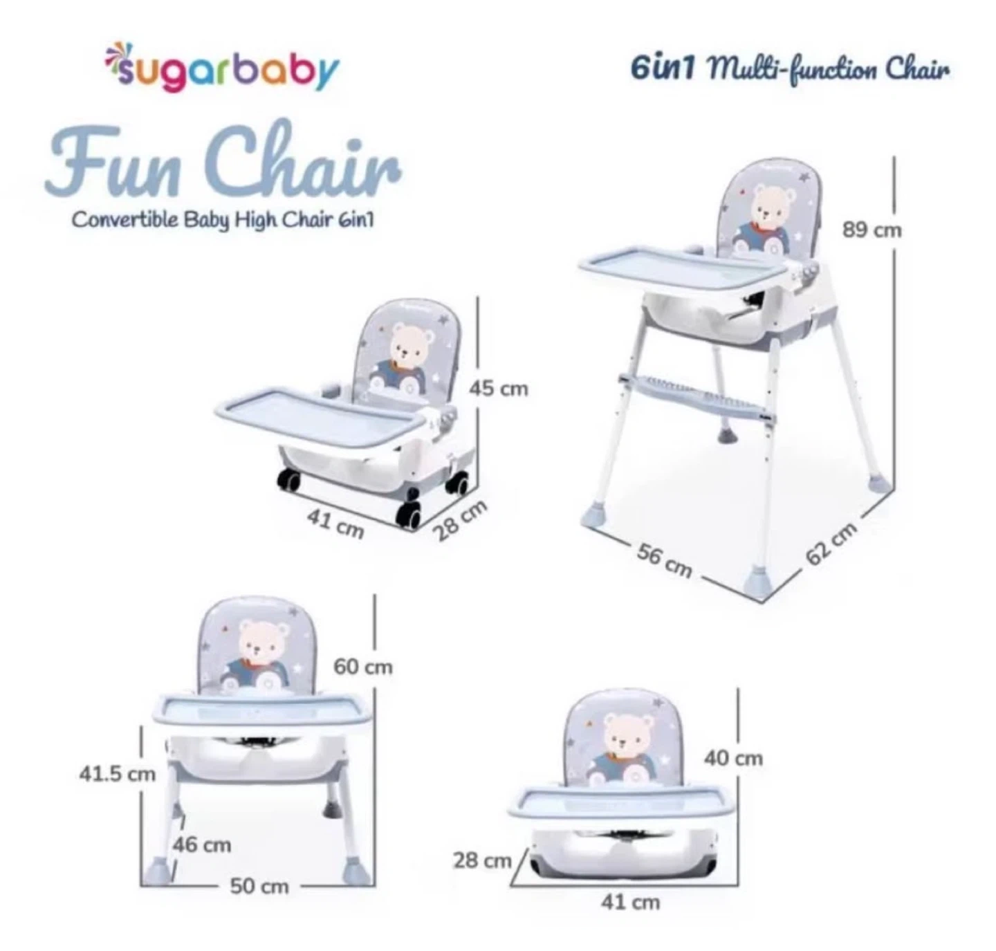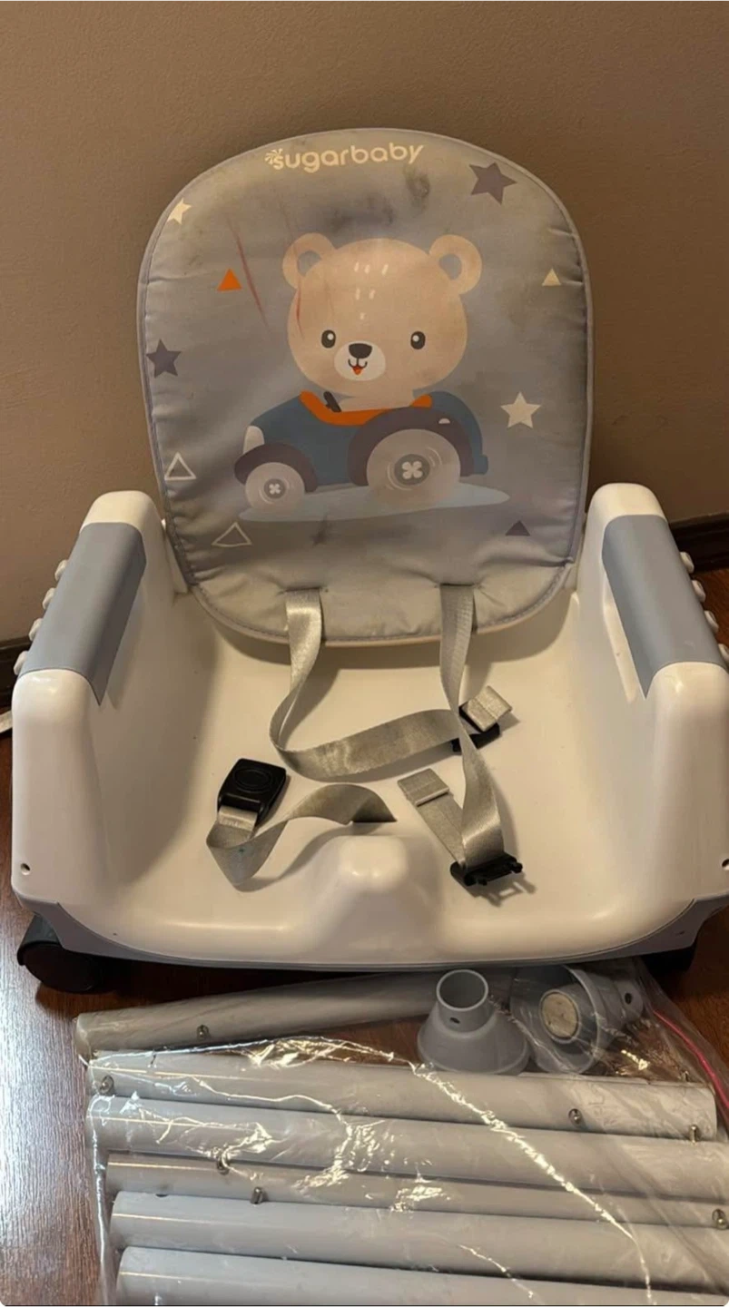 Sugarbaby 6-in-1 convertible fun chair. Converts to high chair, booster seat, or toddler chair. Includes tray and harness. Parts shown are included.