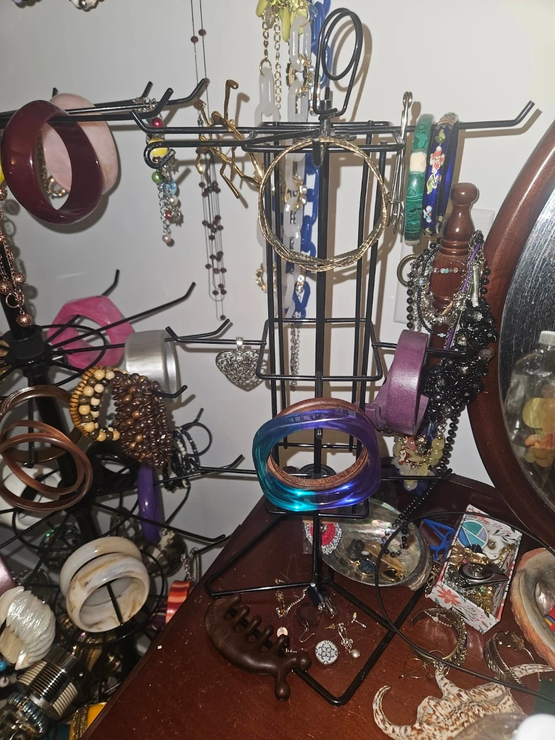 A retail stand i used as a jewelry organizer stand designed to hold necklaces, bracelets, and earrings. It has multiple tiers and hooks for display and storage. It's great for keeping your accessories tidy and accessible.retails use it for unopened lipstick, lipgloss ,chips .fits on the front counter near your cash.i had to up grade as you can see ...hold about 25 bracelets