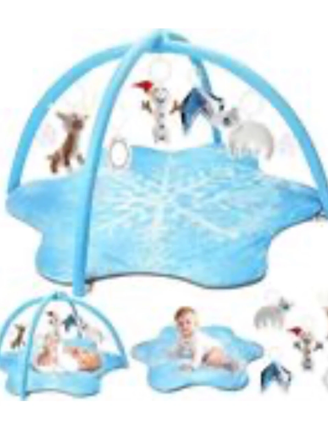 This baby play gym activity mat features a fun Frozen-themed design with cute hanging toys. It's a soft, padded mat for tummy time and play. Suitable for infants and toddlers.