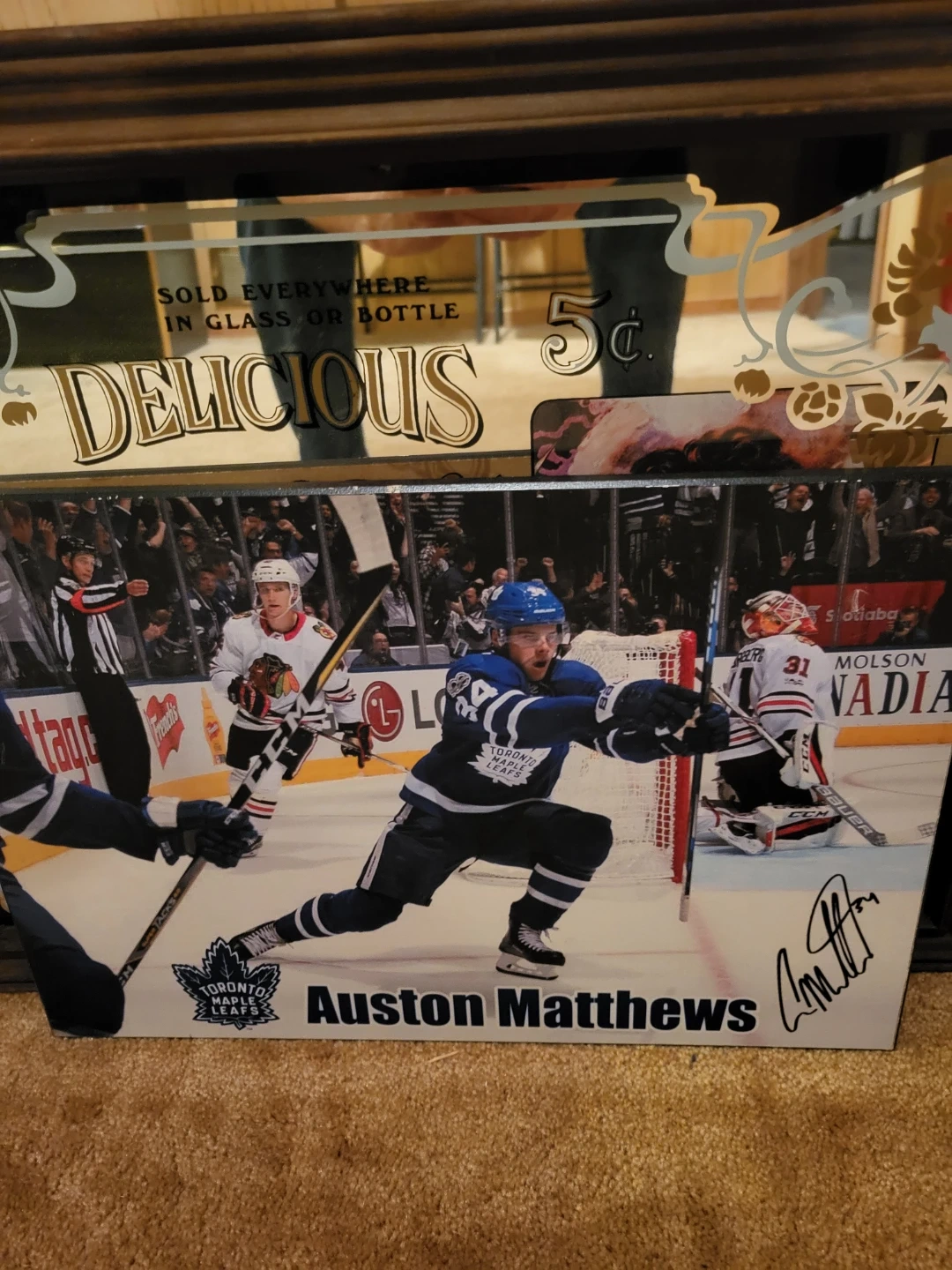 Photo featuring Auston Matthews of the Toronto Maple Leafs. It says 'Delicious' and 'Sold Everywhere in Glass or Bottle'.