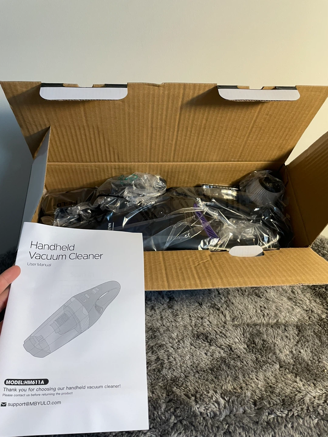 This is a Mbyulo handheld vacuum cleaner, model HM611A. It's cordless and has strong suction with LED lights. Comes with the user manual.