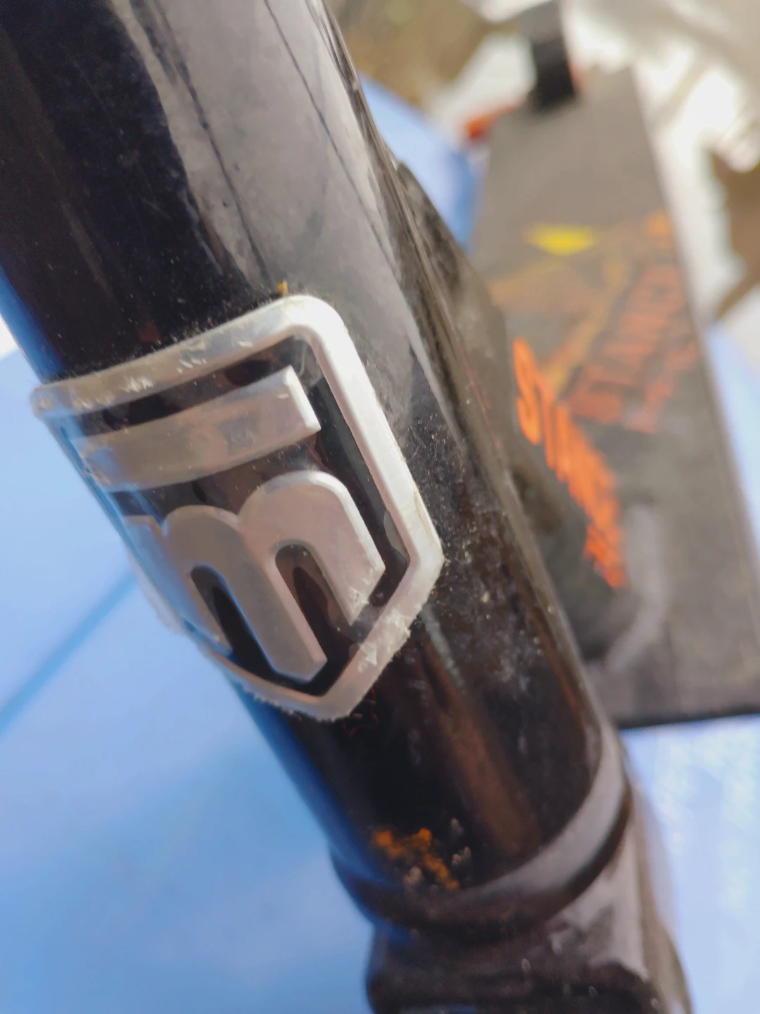This MGP Stunt Scooter is black with orange accents. It's designed for tricks and stunts. Perfect for riders looking to hit the skate park!