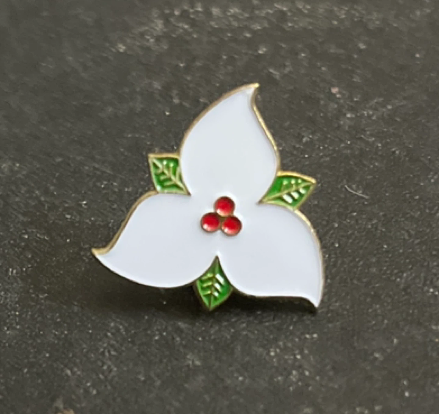 Enamel lapel pin featuring a white trillium flower with green leaves and red berries. It has a gold-tone metal backing with a clasp. This pin is a nice accessory for jackets or bags.