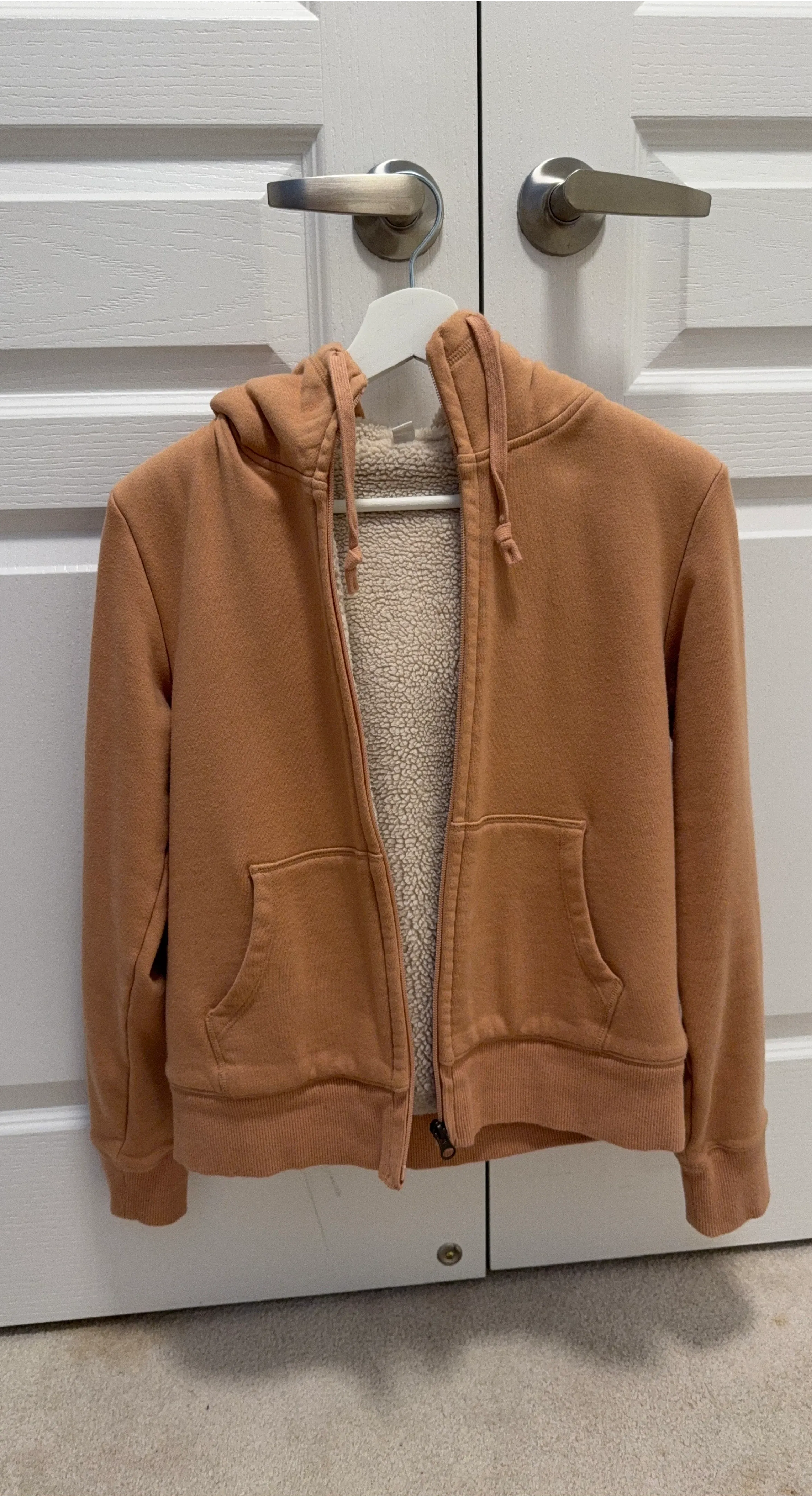 Cozy up in this Uniqlo hoodie! It's an extra small (XS) and features a soft sherpa lining to keep you warm. The outer colour is a lovely beige/light brown. Perfect for those chilly days!