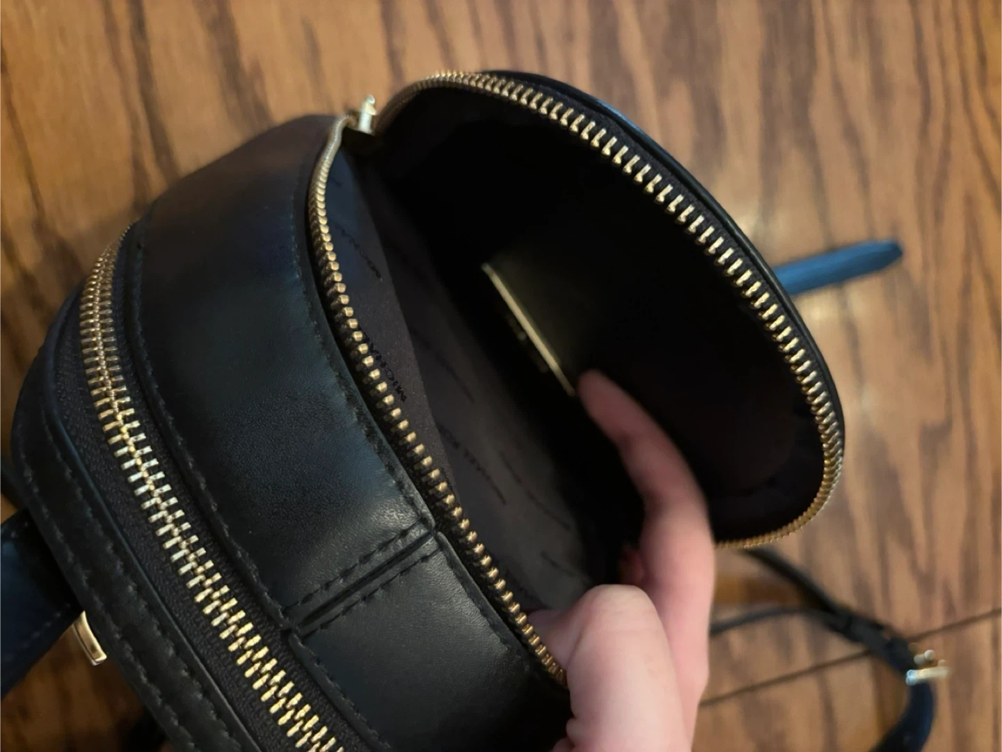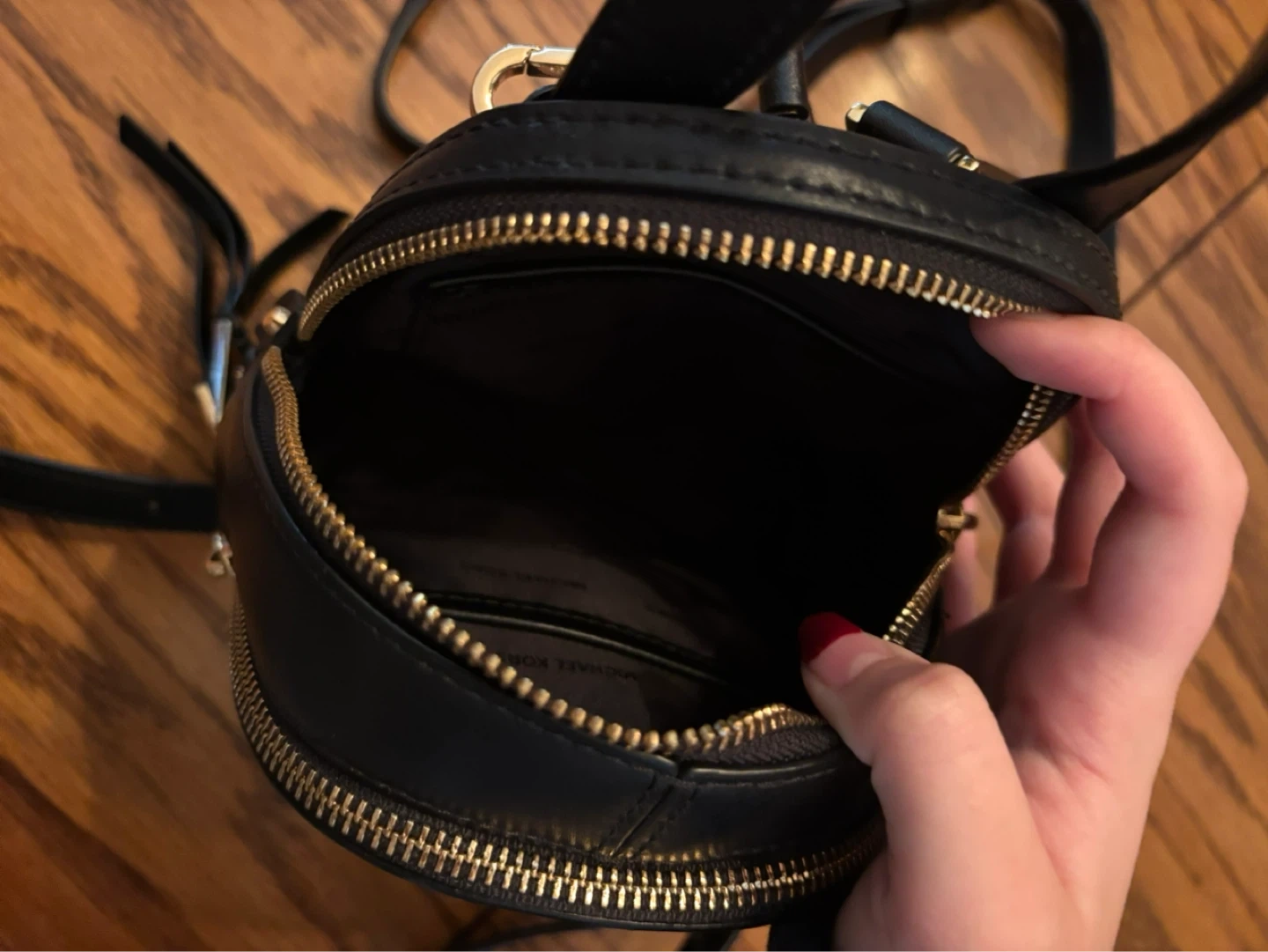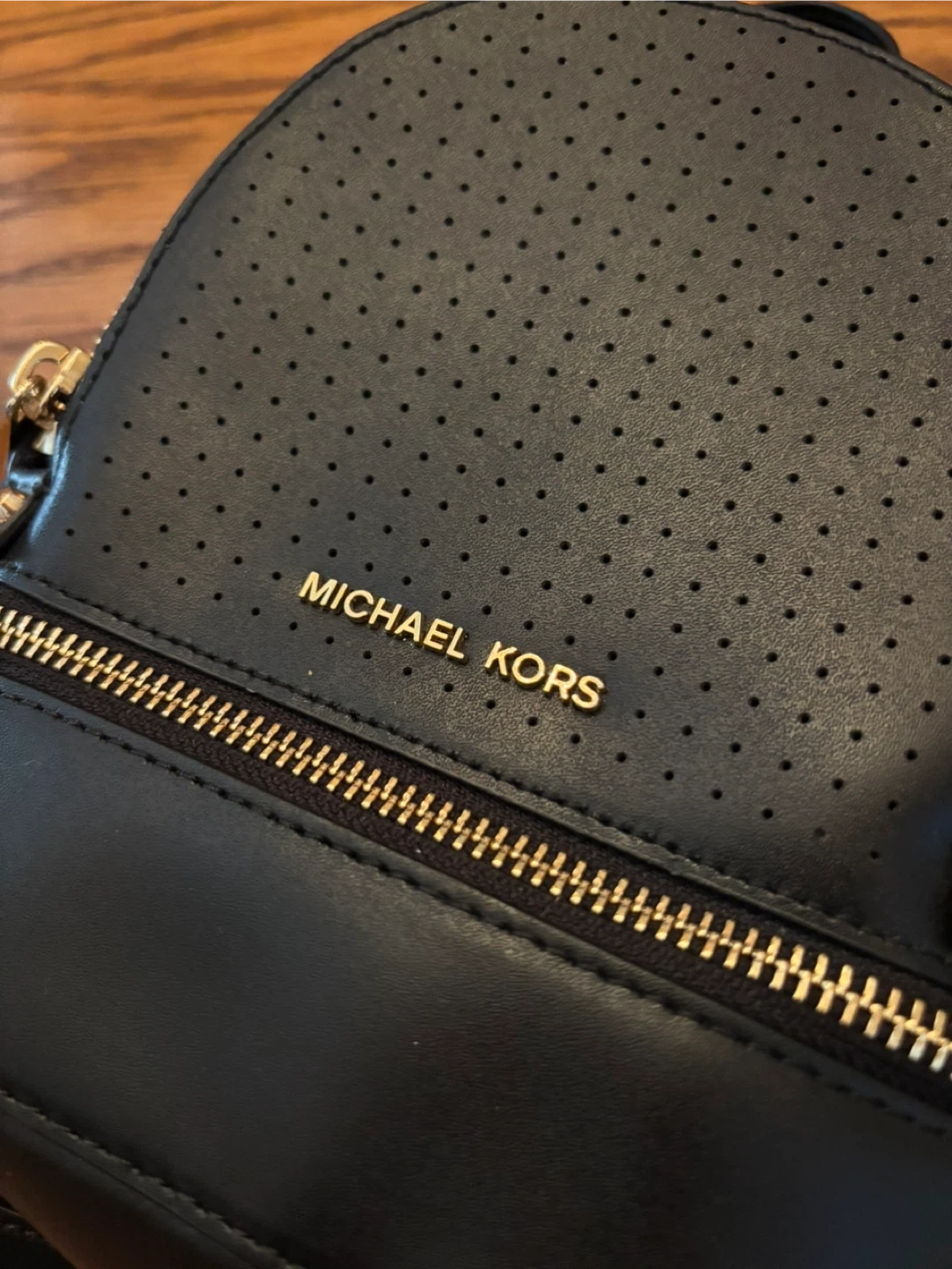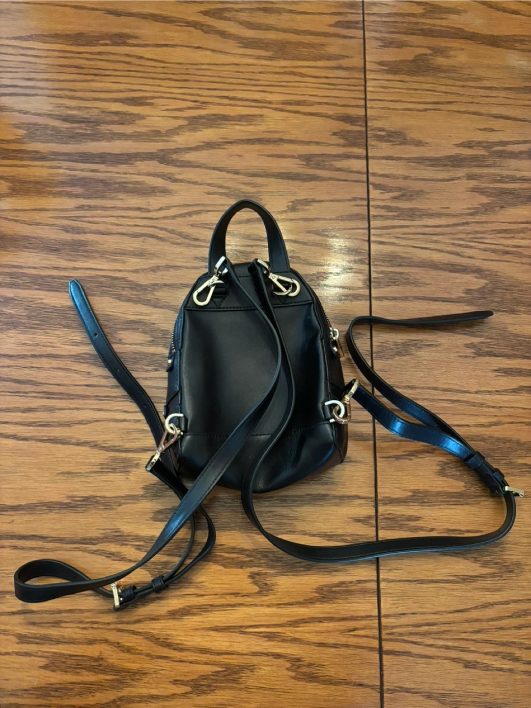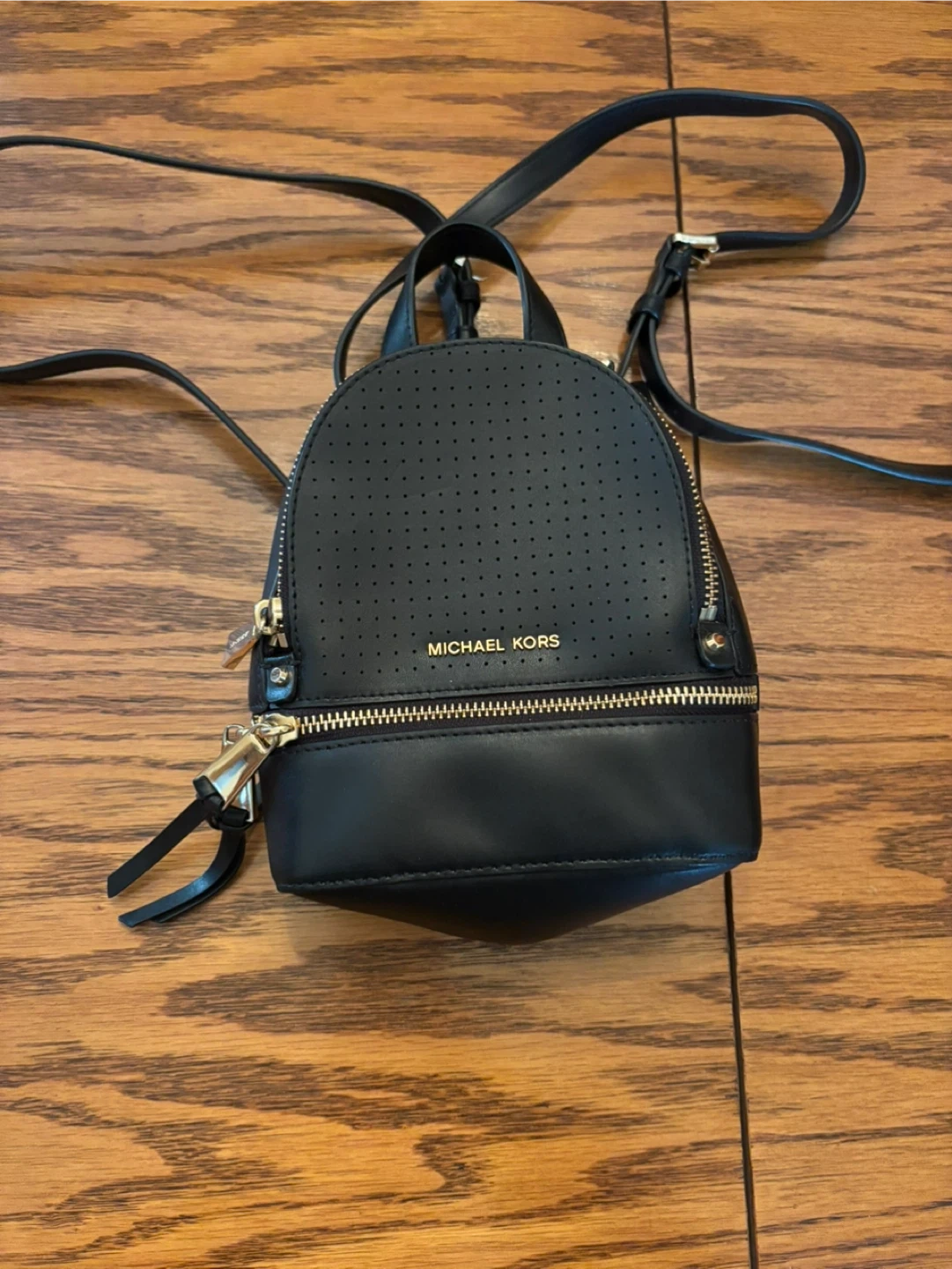 This is a black Michael Kors mini backpack with gold hardware. It has adjustable shoulder straps for comfortable wear. This bag is perfect for carrying essentials on the go!