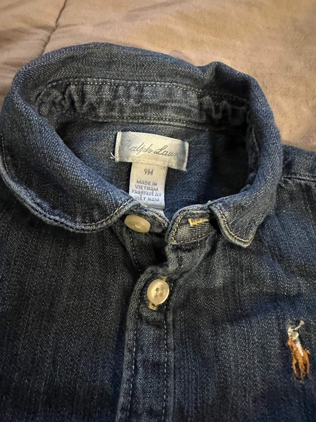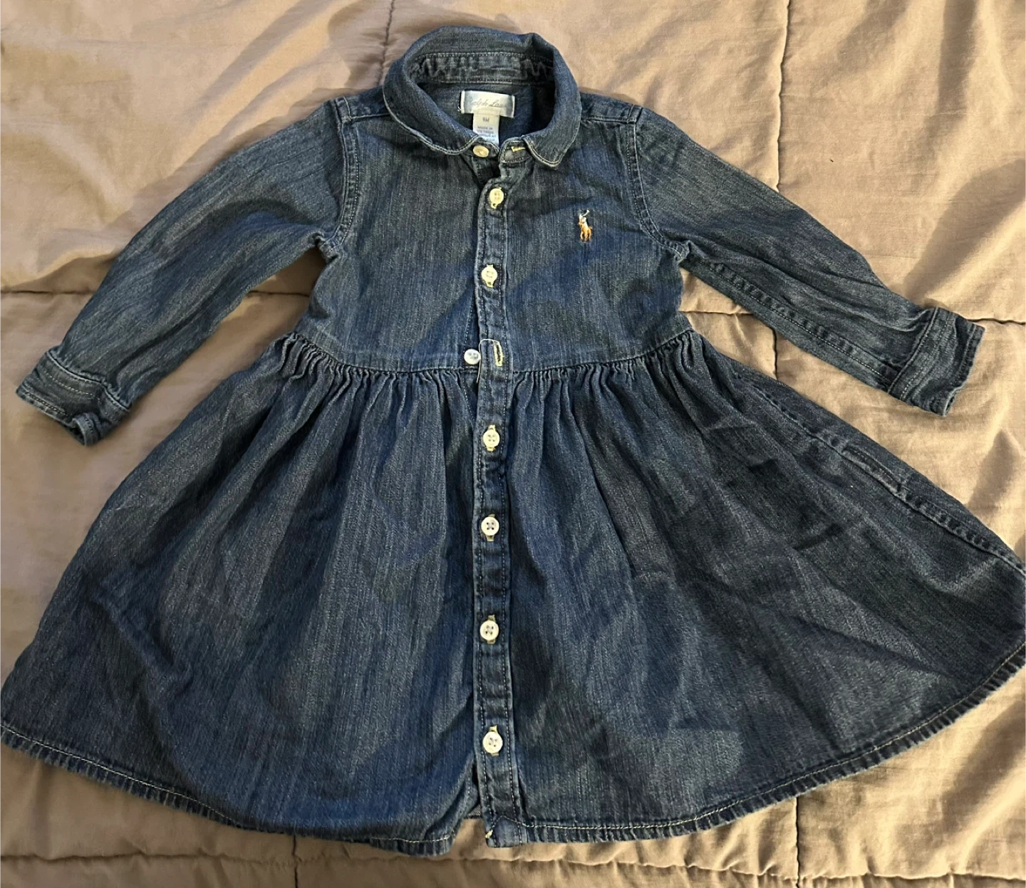 Ralph Lauren denim dress for baby girls. It's a size 9 months. Features a button-down front and a ruffled skirt. Made from 100% cotton. Pick up only East 106 and 1st ave … cash only!