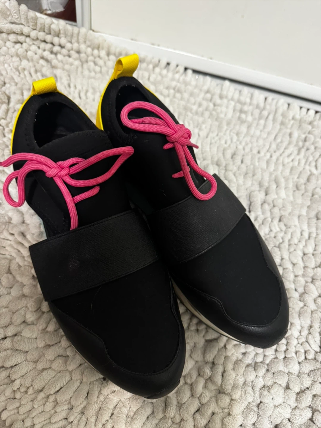 These ALDO sneakers are black with bright pink laces and yellow heel accents. They feature a comfortable slip-on design with a convenient pull tab. Great for casual wear!