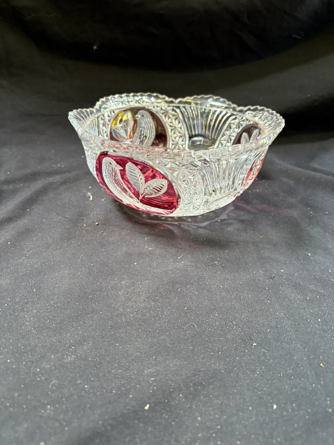 Beautiful crystal bowl featuring intricate designs and lovely red accents. It's in great condition and would make a wonderful addition to any home
