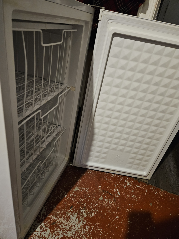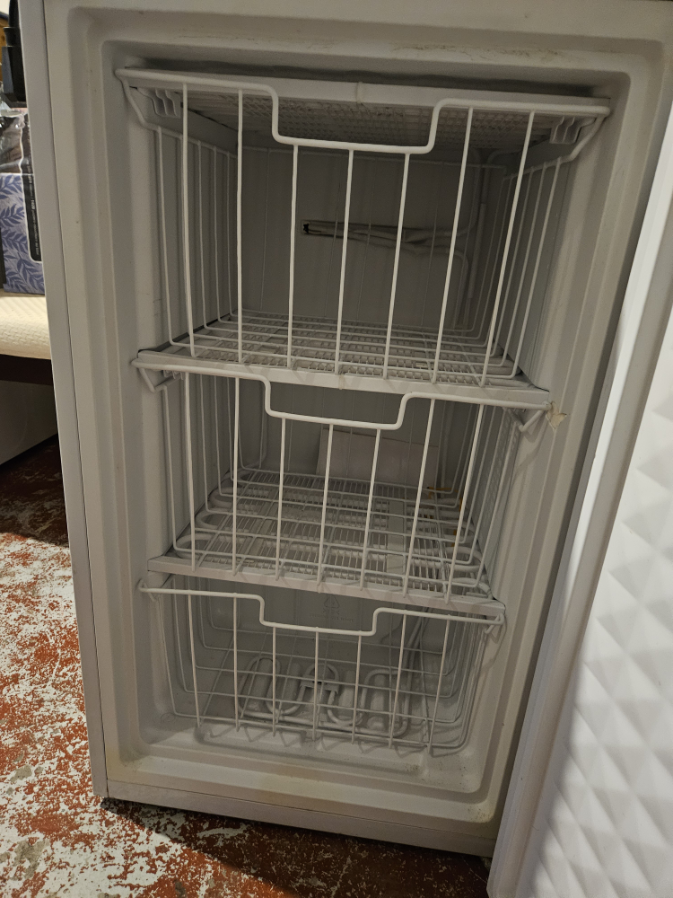 Small upright freezer, works perfectly. Small ding on the front but doesn't affect usage. Perfect for an apartment or as extra freezer storage in the basement.