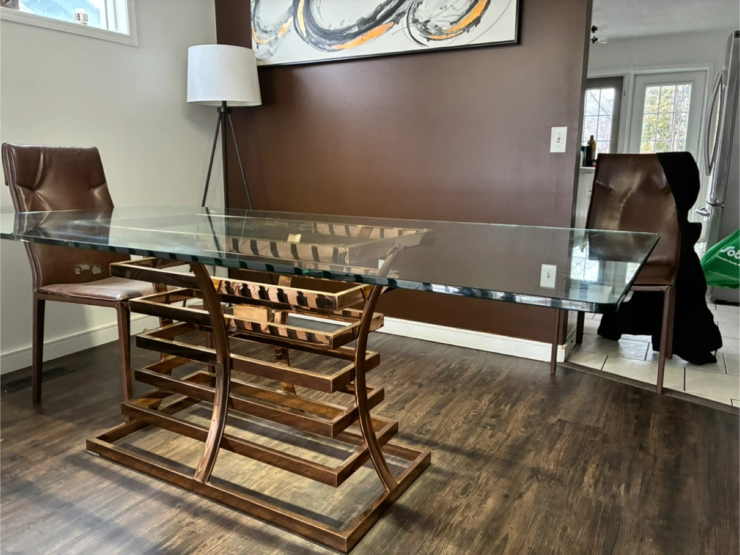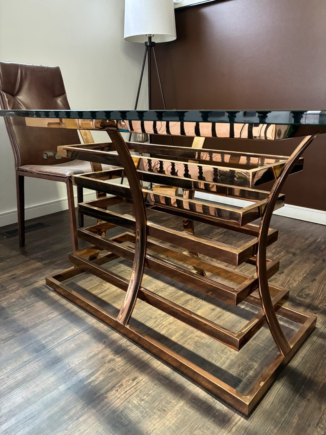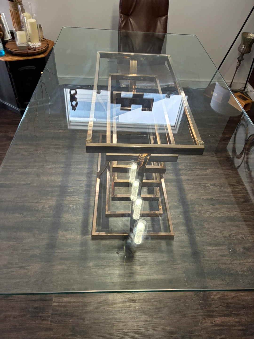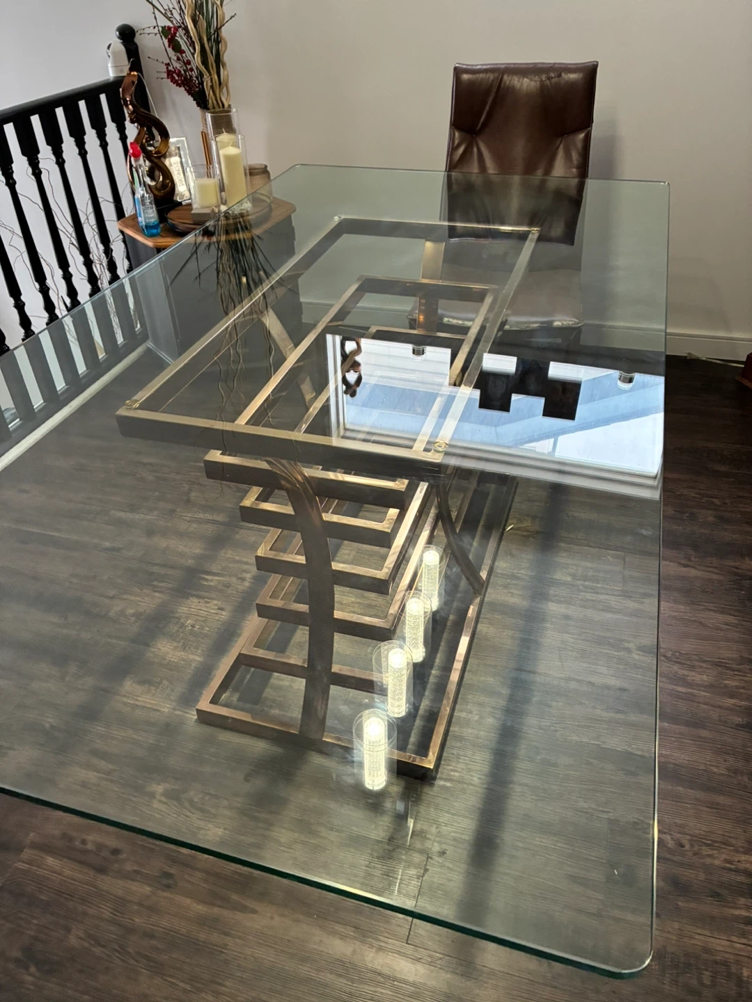 Gorgeous glass top dining table featuring a unique stacked rose gold metal base. This table's striking design makes it a statement piece for any dining room! It's sturdy and built to last. No scratches. Excellent condition