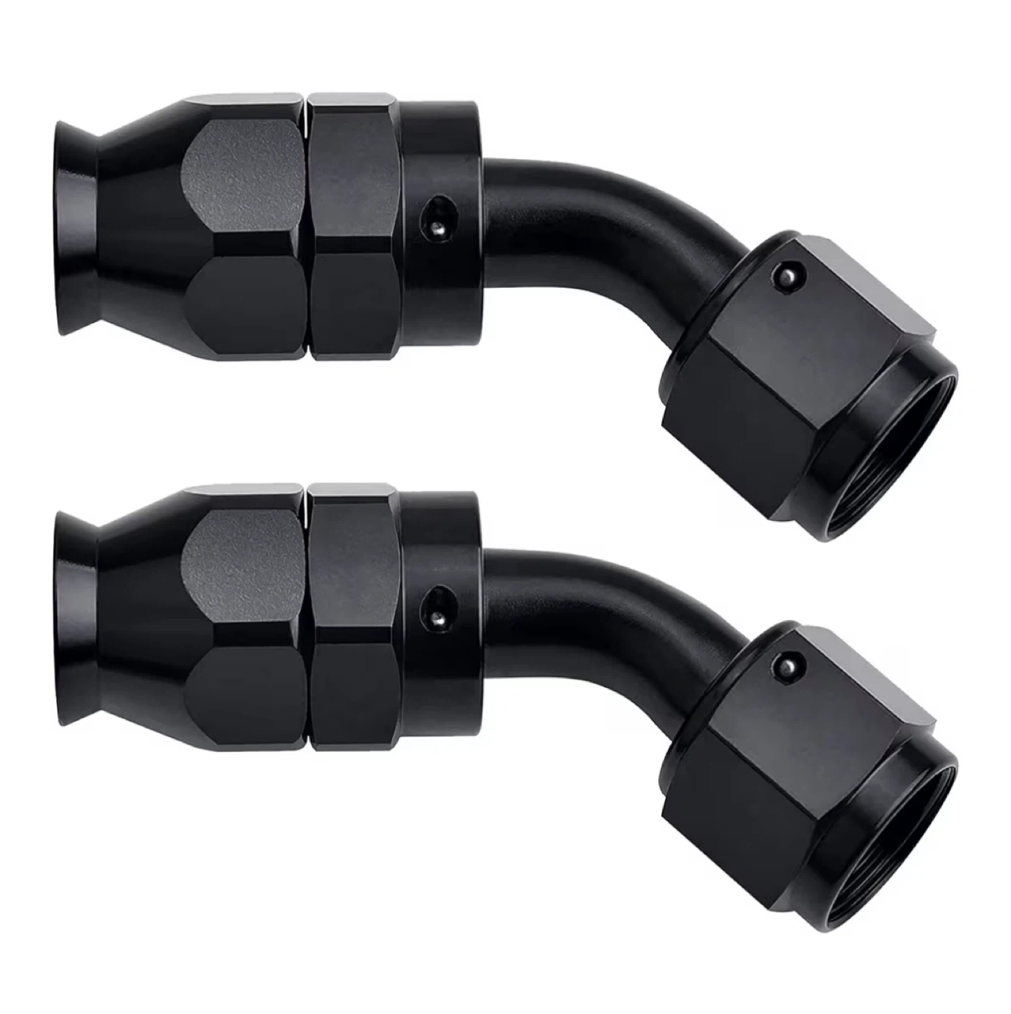 Set of two black 45-degree hose fittings. These are AN fittings, likely for automotive fuel or brake lines. Black anodized aluminum construction.