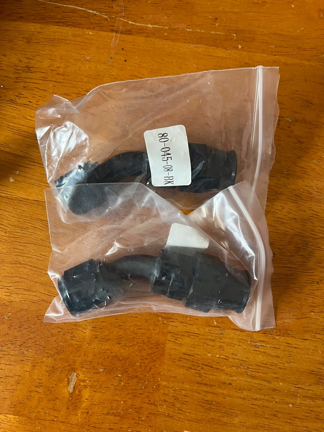 Set of two black 45-degree hose fittings. These are AN fittings, likely for automotive fuel or brake lines. Black anodized aluminum construction.