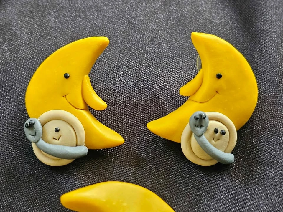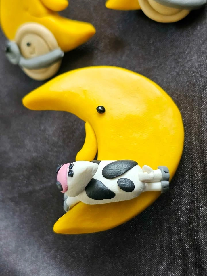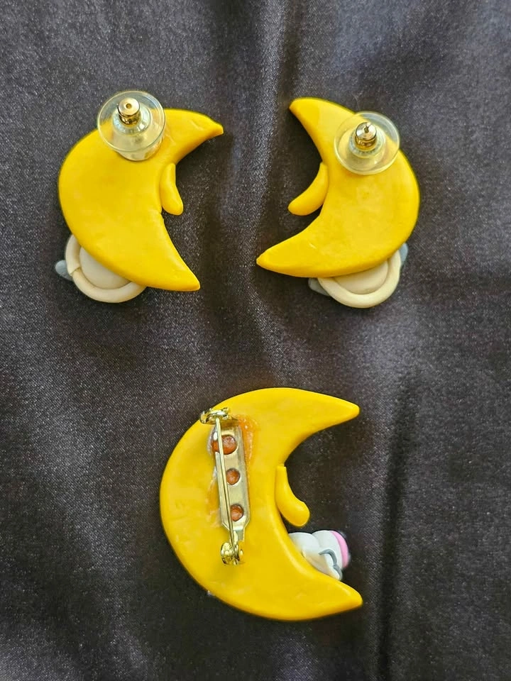 Charming handmade and one of a kind vintage polymer clay jewelry set featuring yellow crescent moons with adorable designs, based on the old "Hey Diddle Diddle" nursery rhyme.