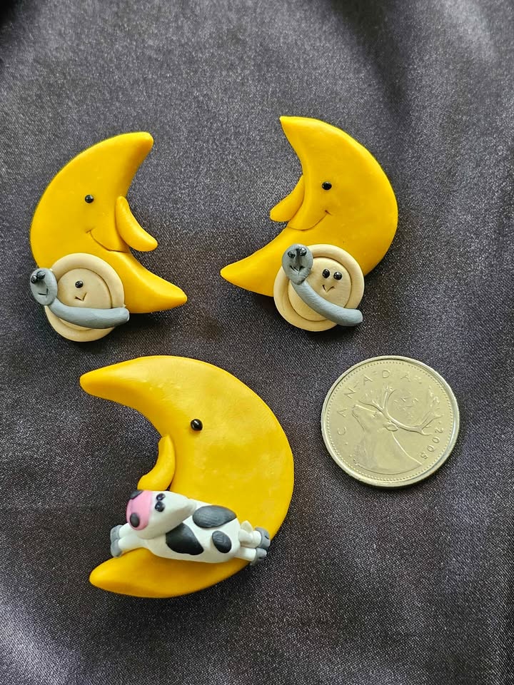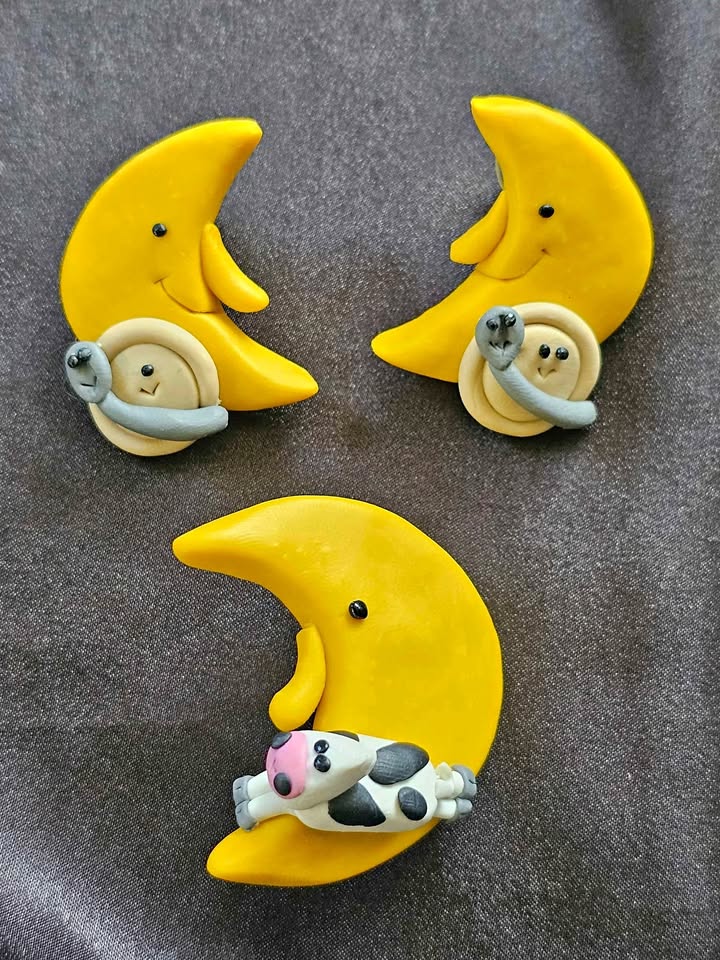 Charming handmade and one of a kind vintage polymer clay jewelry set featuring yellow crescent moons with adorable designs, based on the old "Hey Diddle Diddle" nursery rhyme.