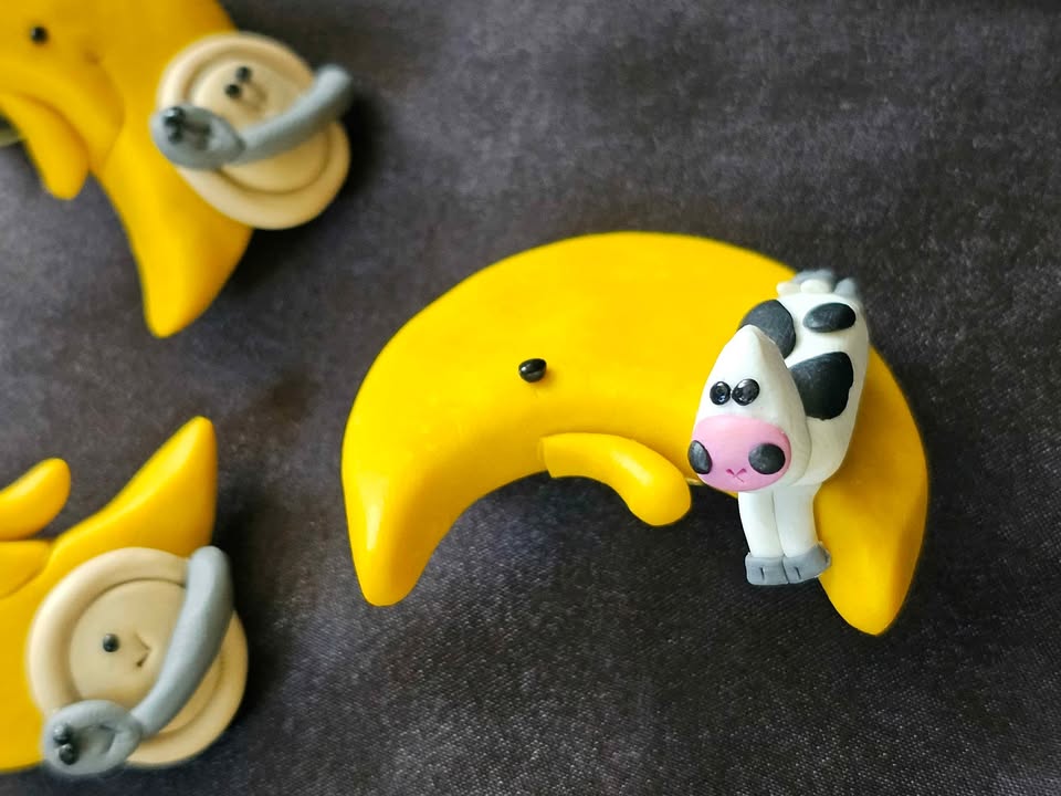 Earrings + Brooch Set Moon and Cow Polymer Clay Vintage