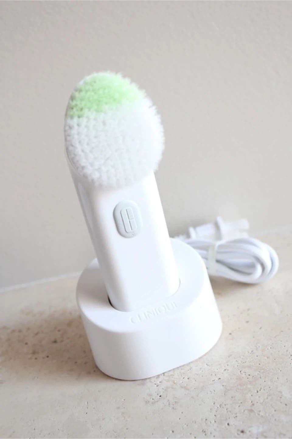 Clinique Sonic System purifying cleansing brush with its charging cradle and user guide. This sonic experience offers a purifying clean for your skin. It's designed to go beyond cleansing with applicators for makeup and treatment.