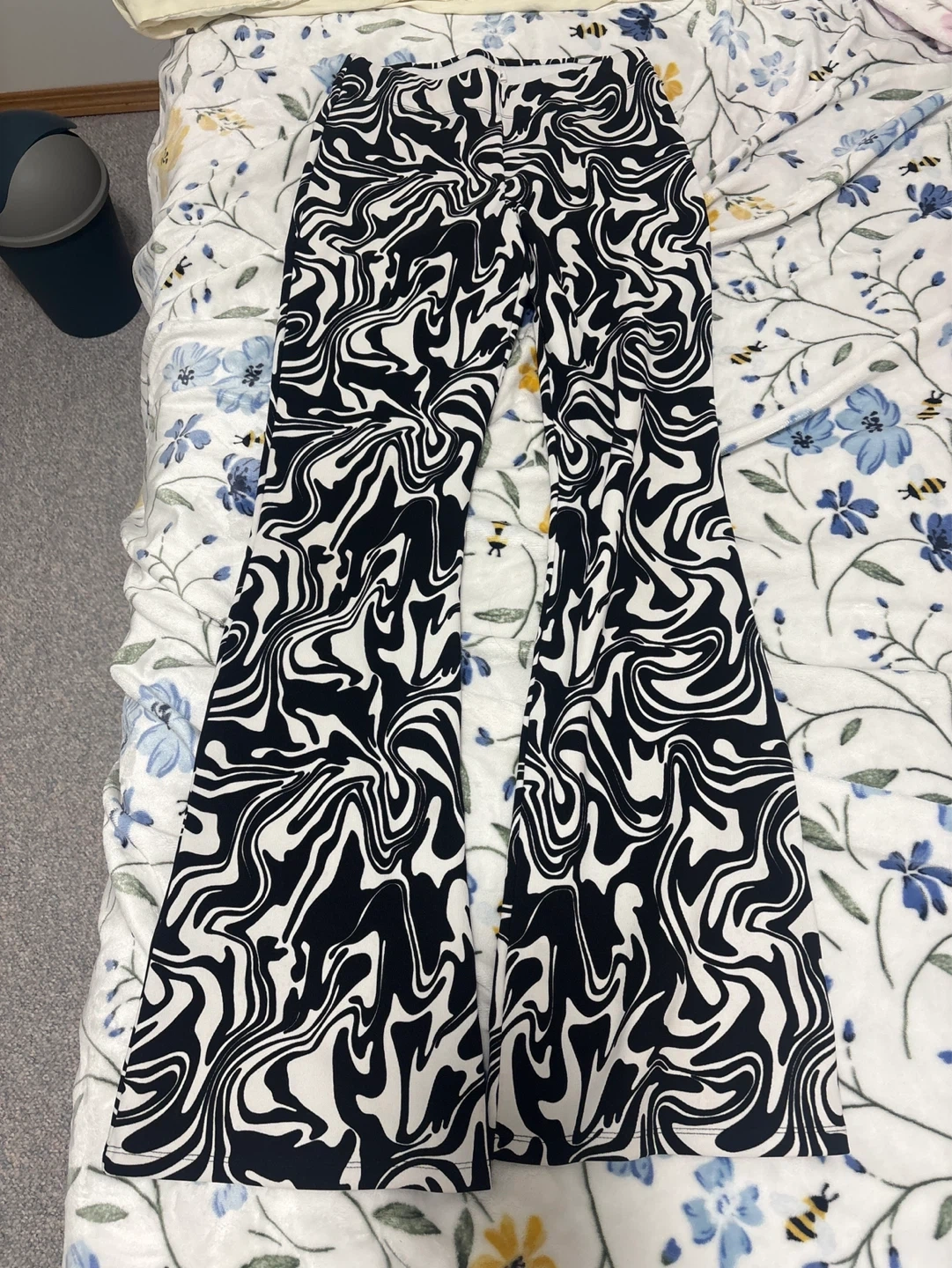 These bell bottom pants have a black and white swirly pattern. The material is stretchy and comfortable. They're a fun statement piece! Size small pick up cash only