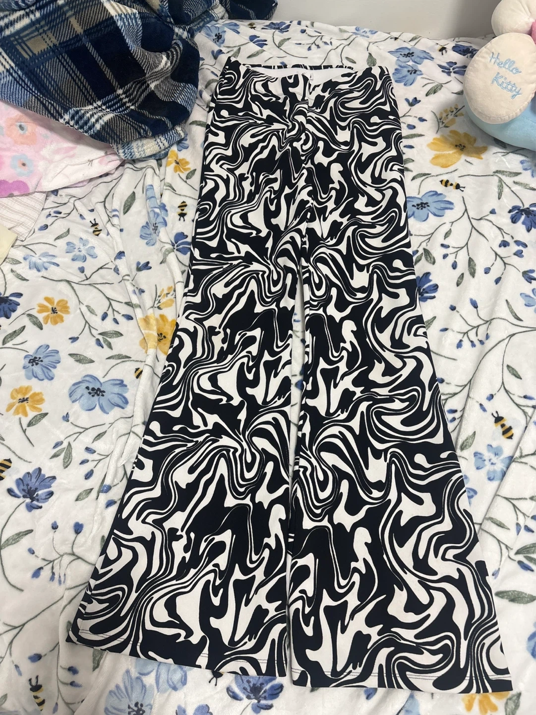 These bell bottom pants have a black and white swirly pattern. The material is stretchy and comfortable. They're a fun statement piece! Size small pick up cash only