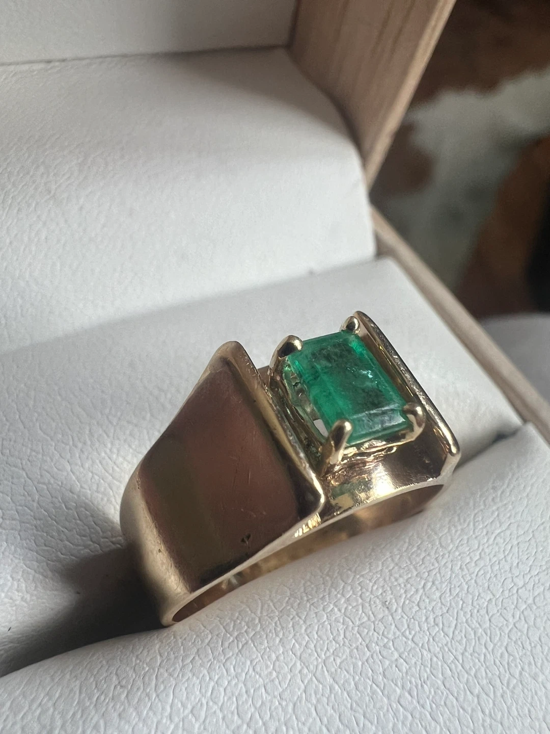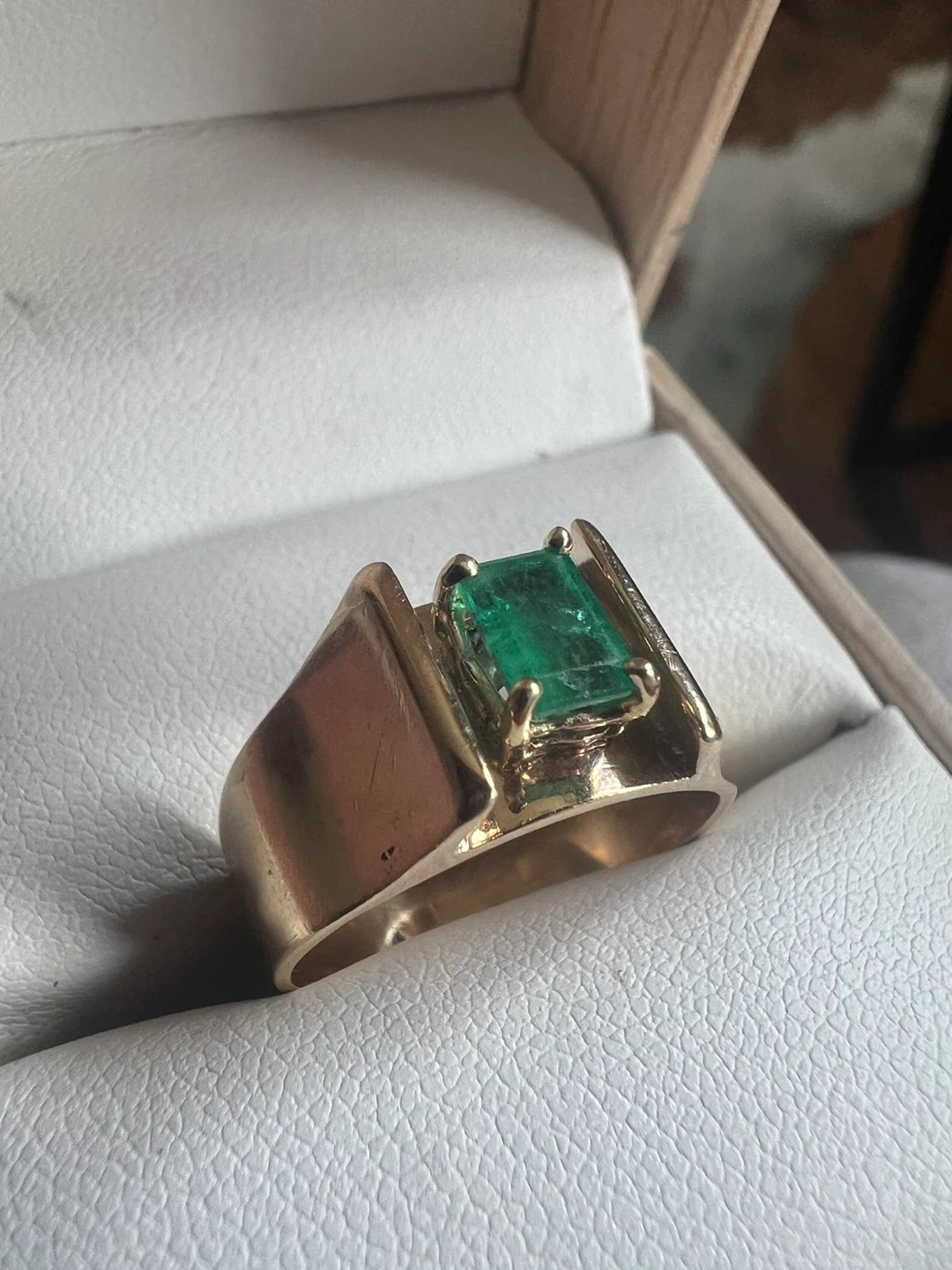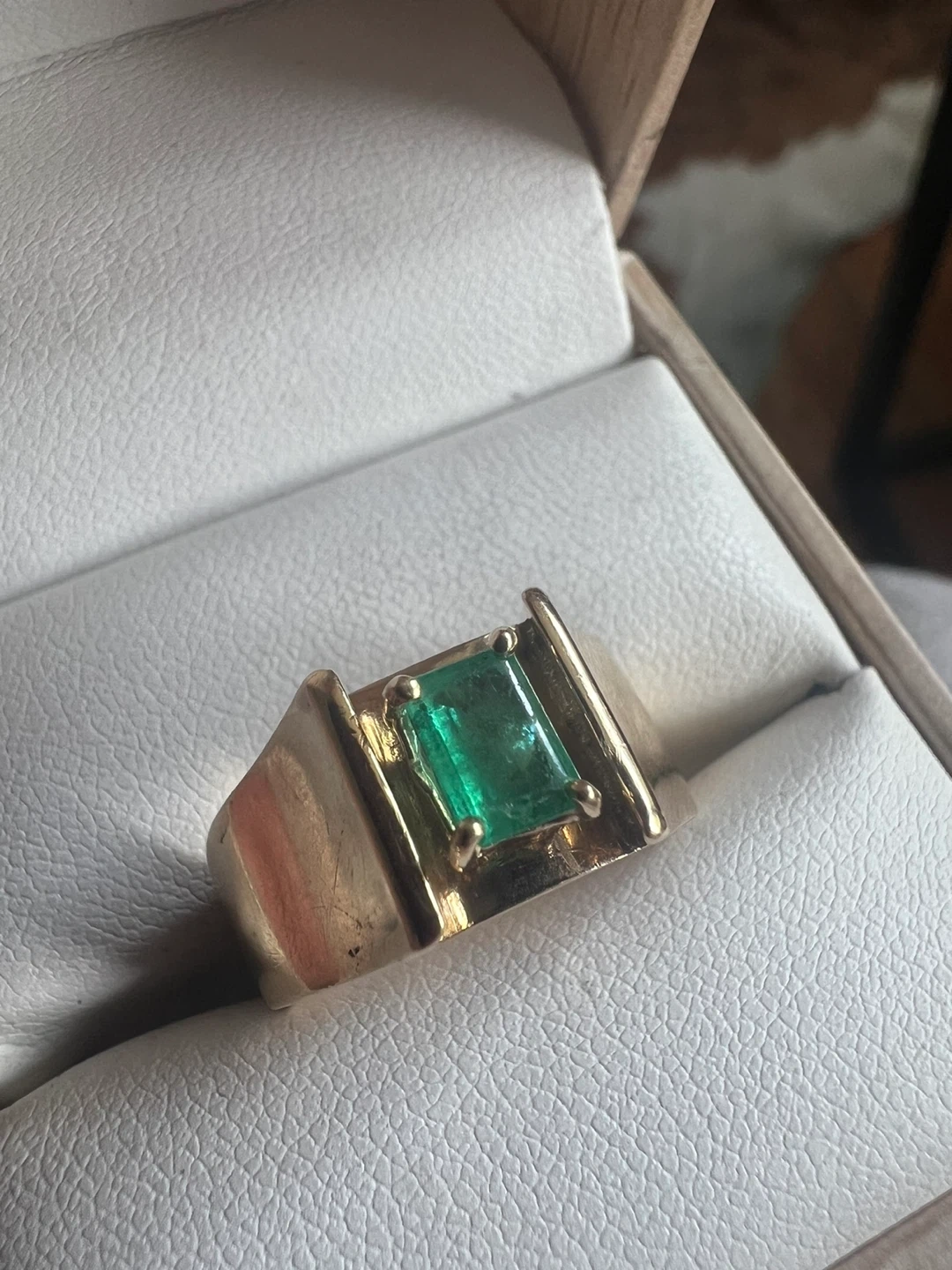 Here's a beautiful 14 k emerald ring with a gold band. It's in great condition and comes with a box for safekeeping. Size 7-7.5