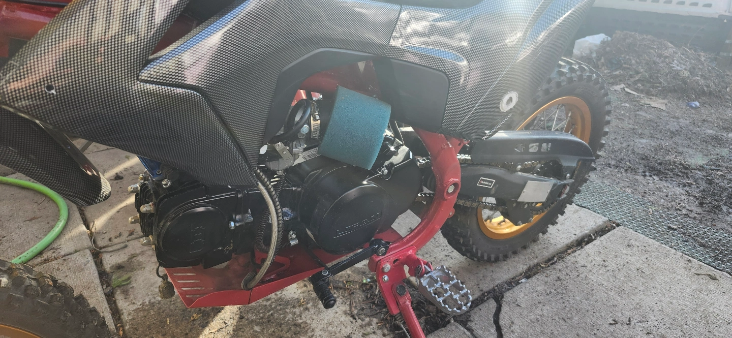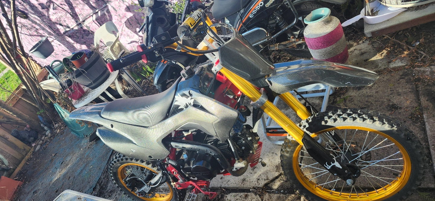 Lightly used 140cc dirt bike. Gold rims. Carbon fibre look body. Great for beginners. machine racing carb