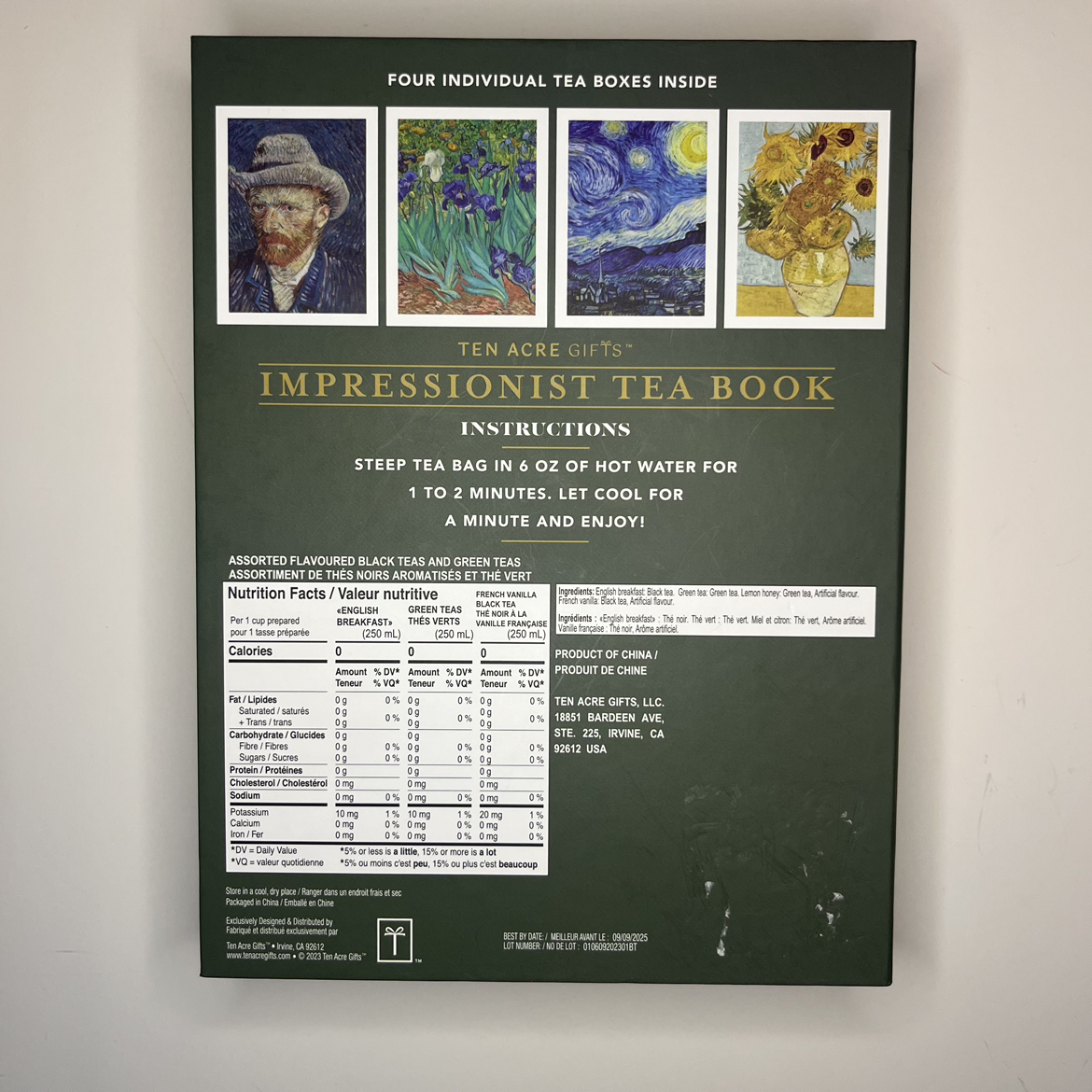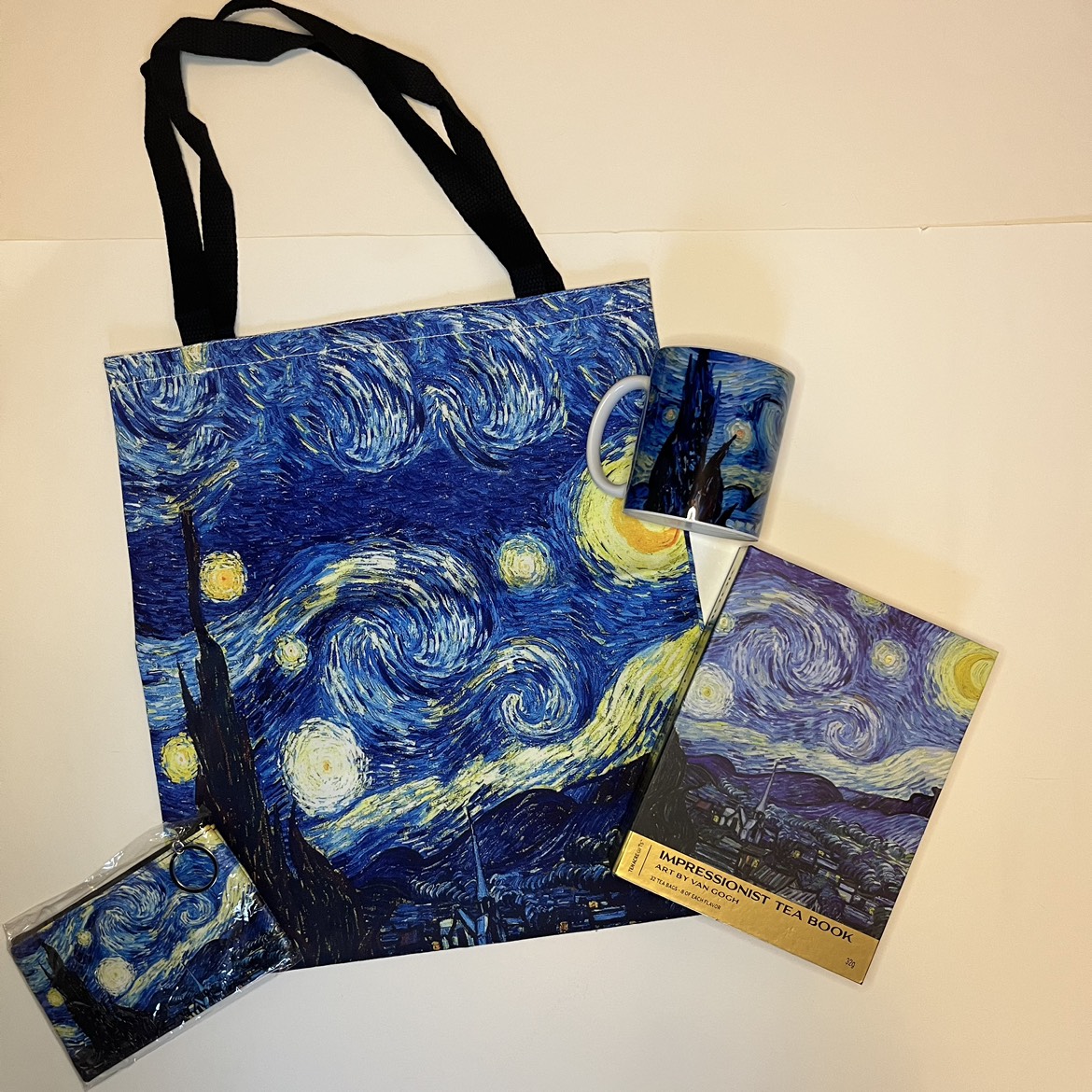 Includes a tote bag, coin purse, and mug featuring Starry Night, along with assorted tea featuring some of his famous works of art.
