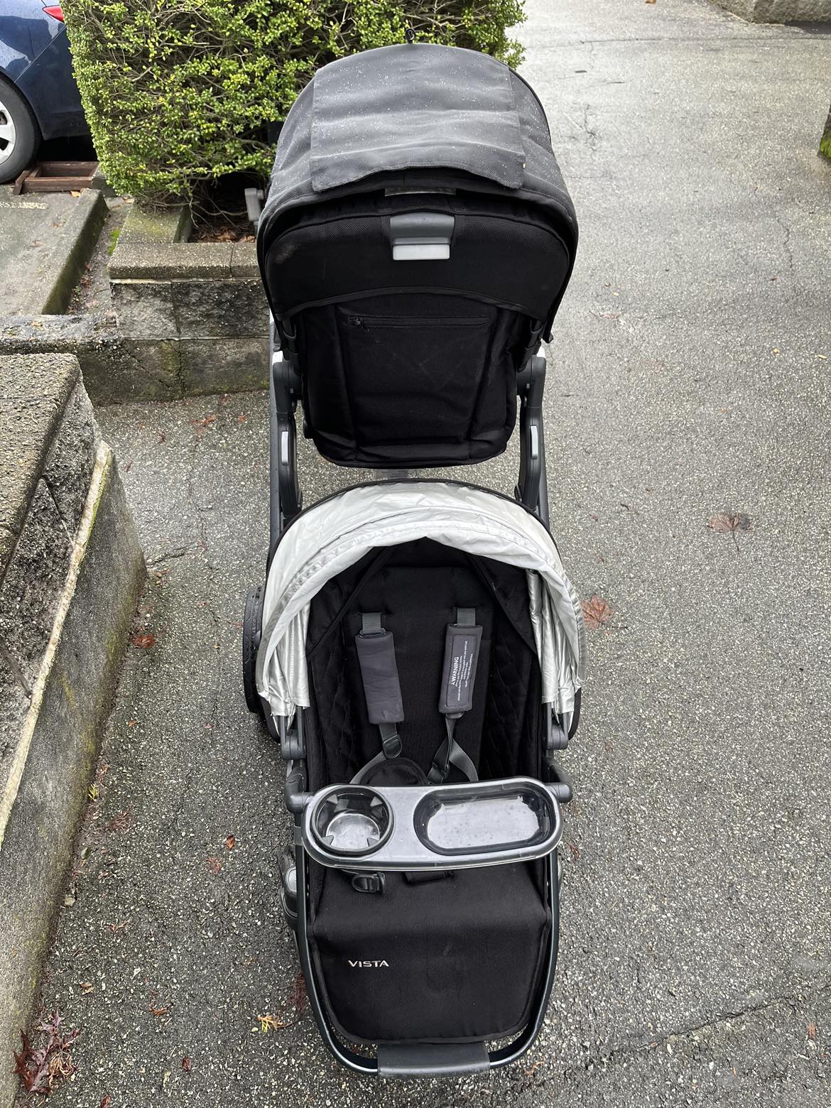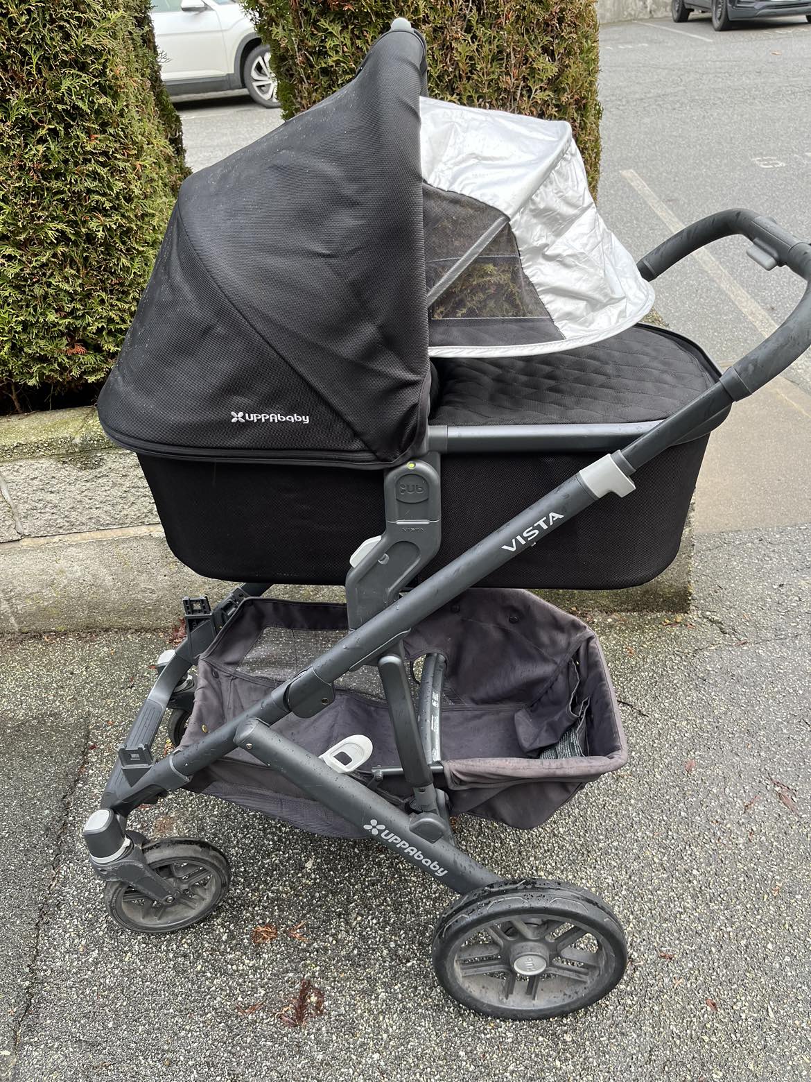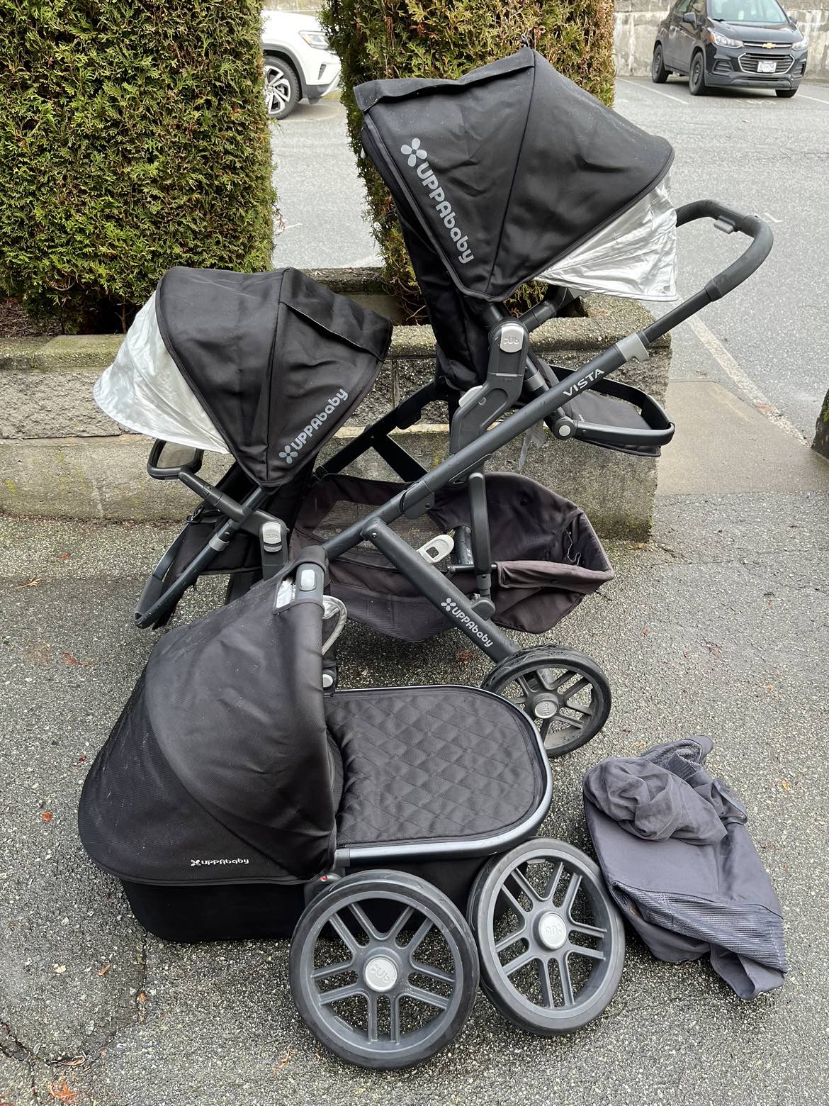 Comes with 2 main seats, 1 rumble seat, 1 bassinet, bassinet mosquito net, a snack tray, upper adapter, lower adapter, extra basket and 2 spare wheels.
