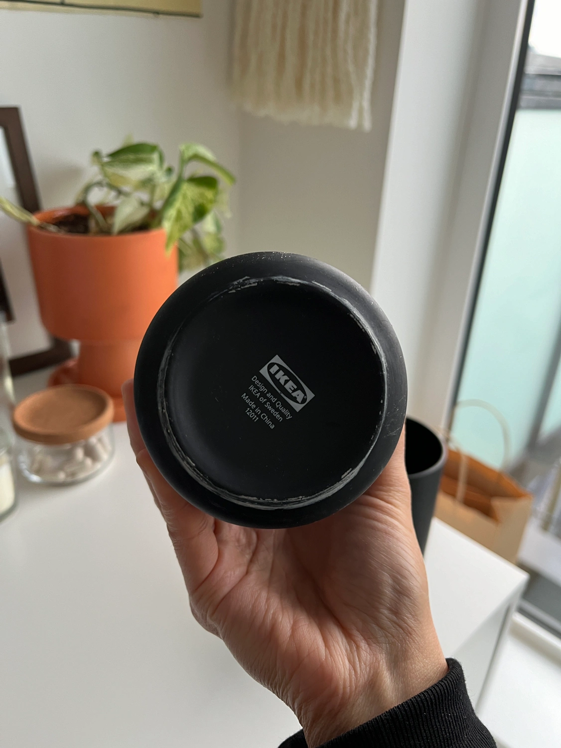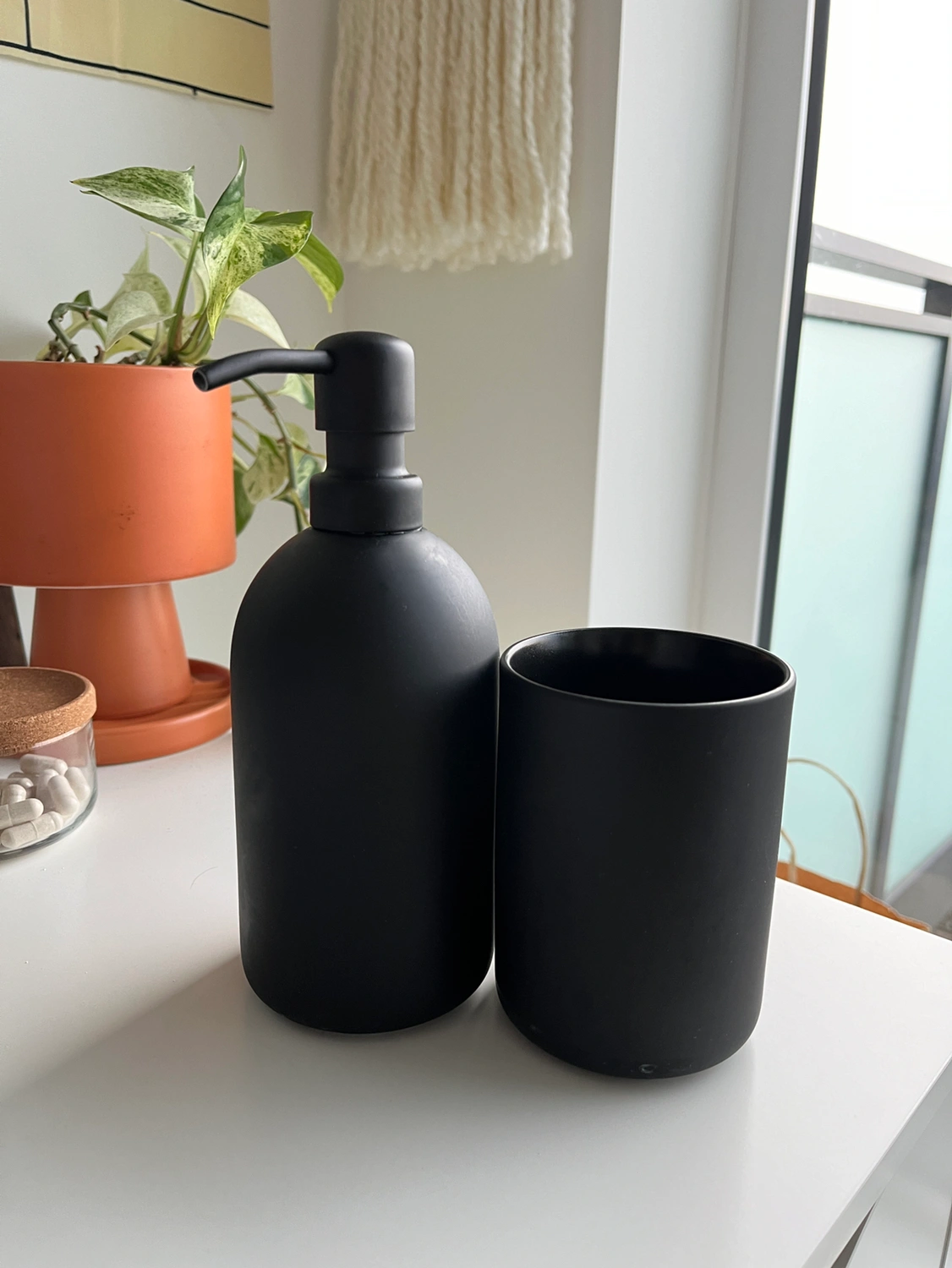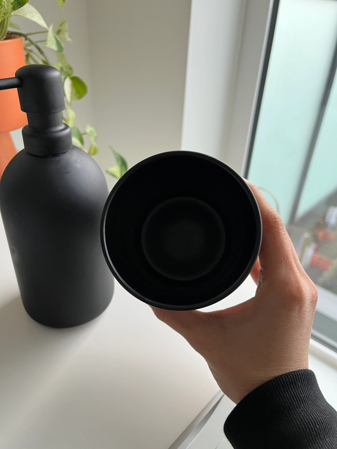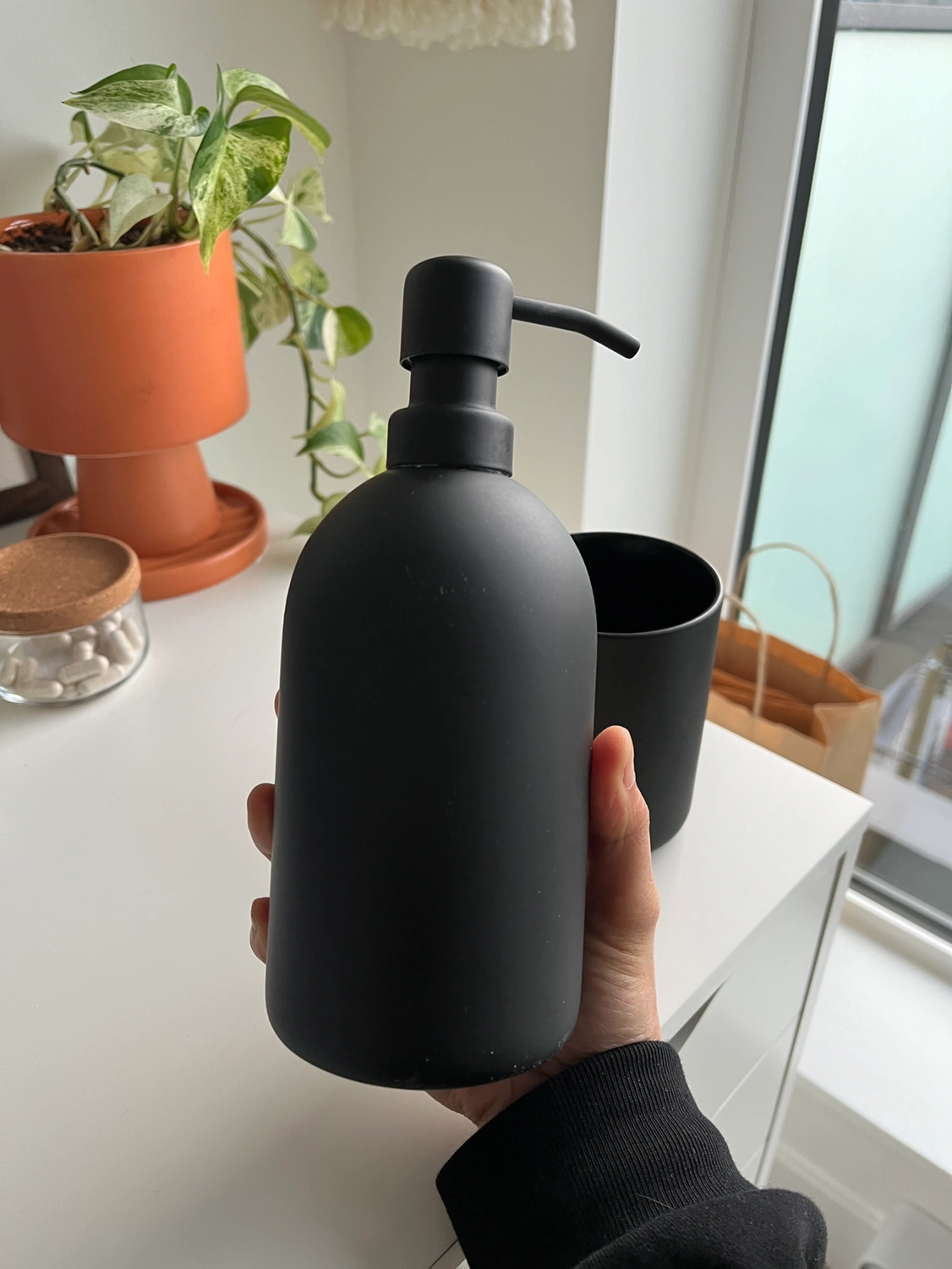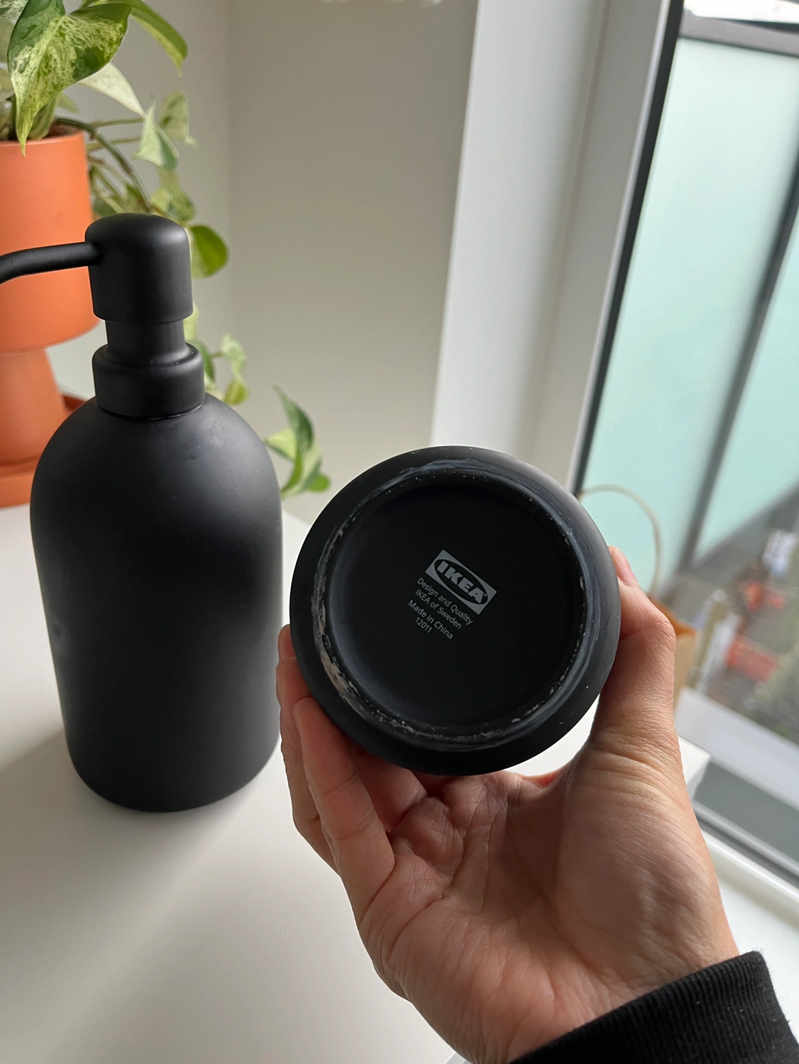 Black soap dispenser/pump and cup from IKEA. It’s the GANSJÖN set but missing the tray. I’m giving this away because we moved and it doesn’t fit the style of our space anymore. It’s in good condition but a bit of the colour is rubbing off on the bottoms.