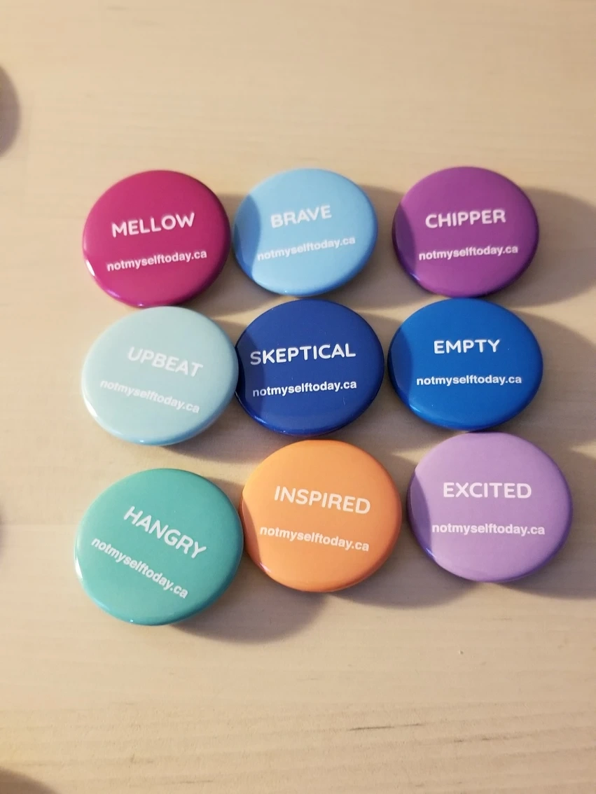 Collection of pinback buttons with different emotions on each, various colors. 24 different emotions plus one Not Myself Today button.