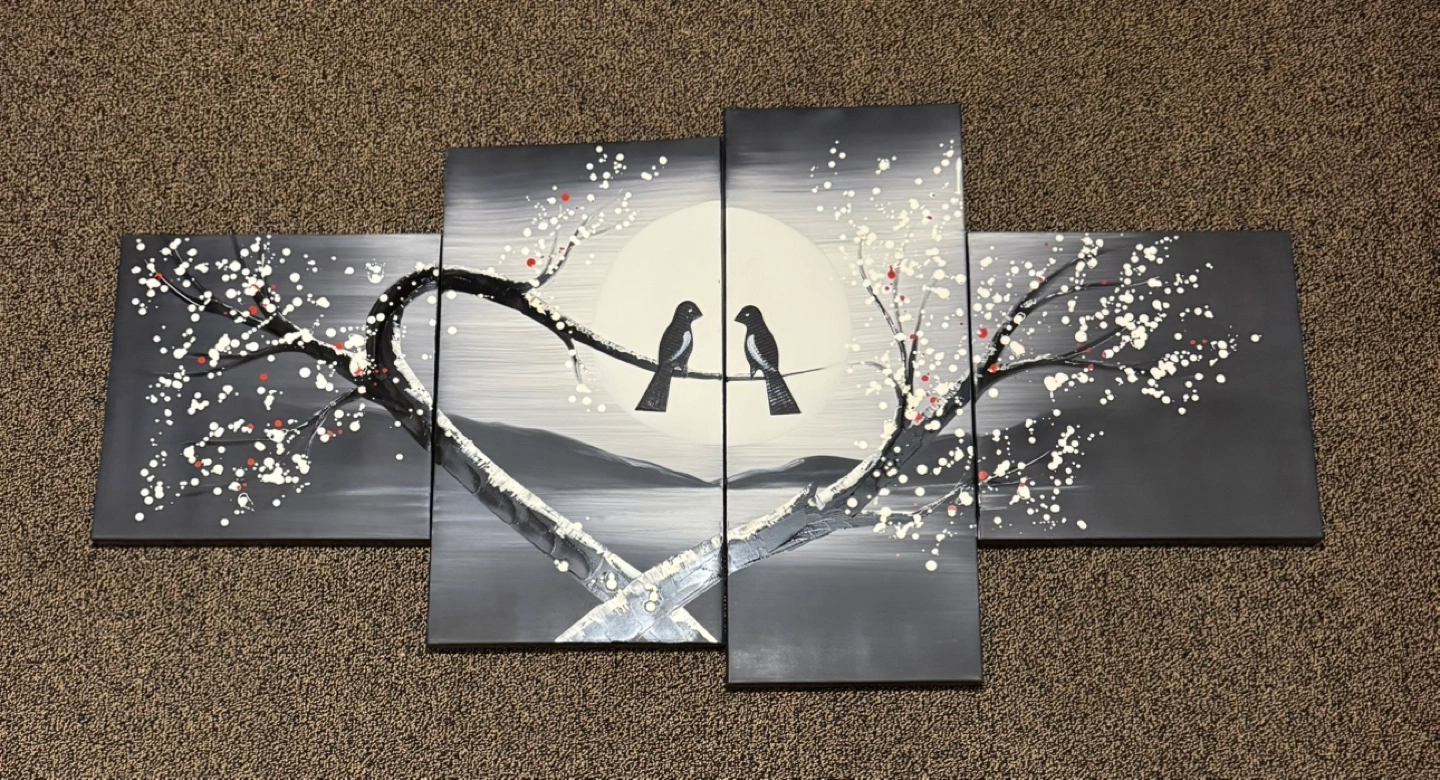 Black and white canvas painting. Two birds perched on a tree branch. The background is a grey sky and a large moon. Each canvas is a quarter of the overall image and must be hung together.