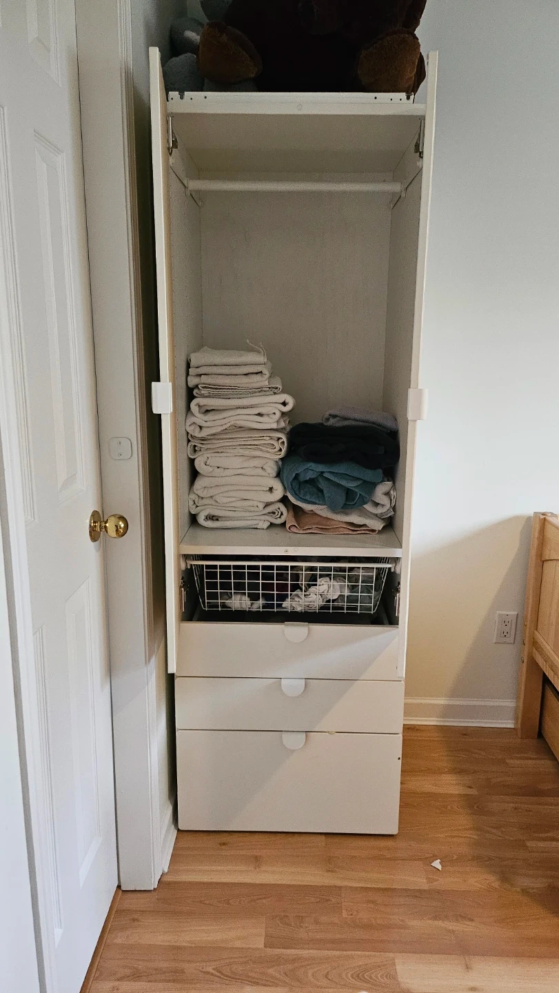 This IKEA Smastad wardrobe is perfect for organizing kids clothes and accessories. It features 2 doors, 3 spacious drawers for ample storage, 1 hanger bar, and a basket drawer