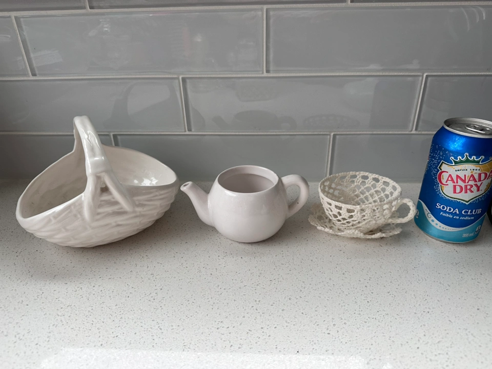 Buy & SellWithe decor. Ceramic basket, mini tea pot & doily molded tea cupWithe decor. Ceramic basket, mini tea pot & doily molded tea cup$18$20 for allWHERE TO MEET187 & 64 SurreyView MapSELLERSoncaE Clayton W Extension361 review0 chats·0 favorites·46 viewsSEND CHAT TO SELLERHi Sonca! I’m interested in your listing.Hi Sonca! I’m interested in your listing.Get the Karrot app to chatSign In to chat