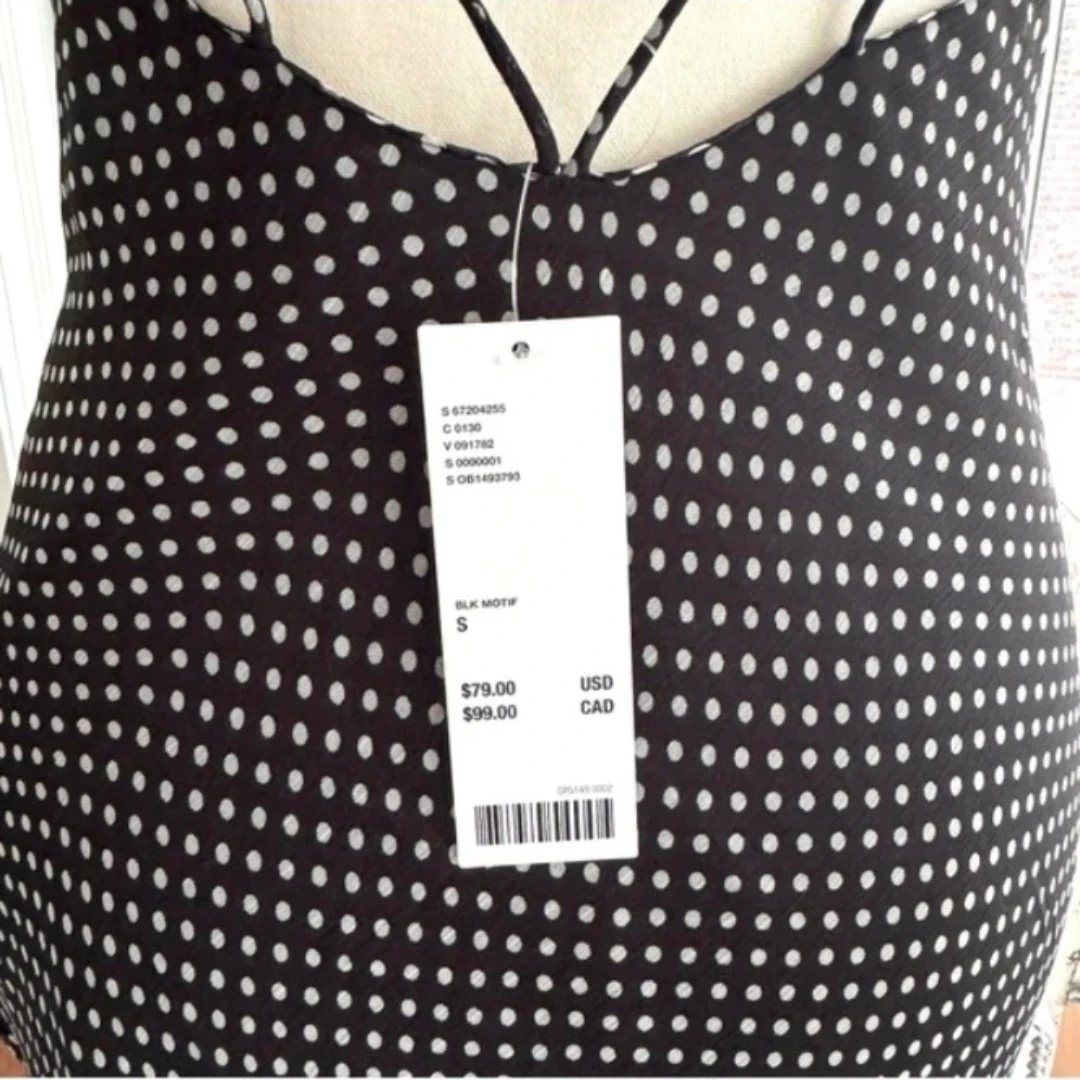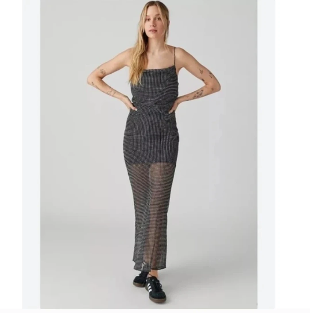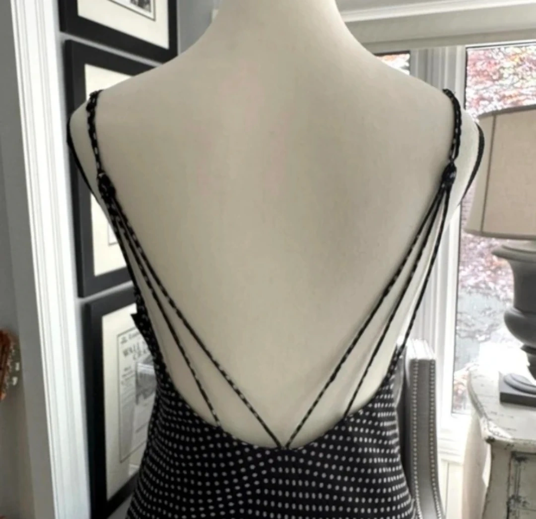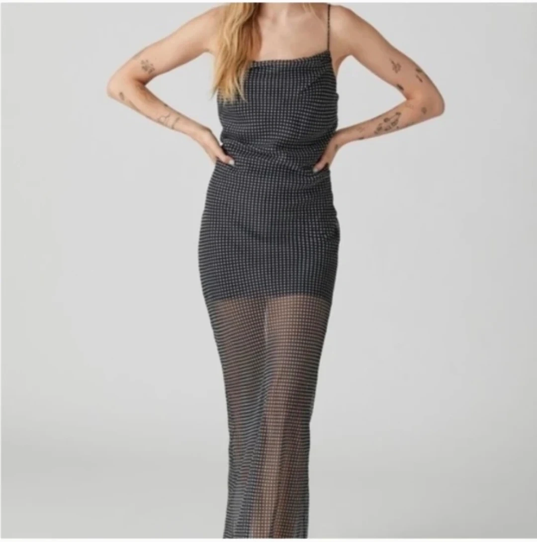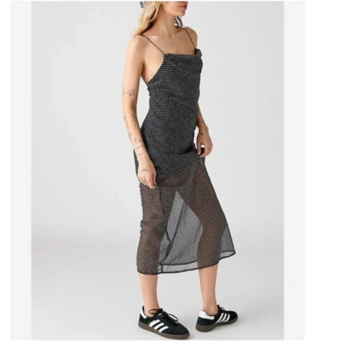 Sheer polka dot slip dress with adjustable spaghetti straps. It's a midi-length dress with a cowl neck. This dress is perfect for a night out!